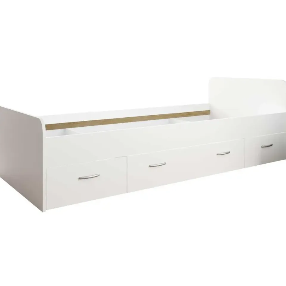 Het functionele Barko-Bed van Emob is het perfecte kinderbed met een natuurlijke flair. Het bed is gemaakt uit gefolieerde spaanplaat in wit. De functionaliteit zit hem met name in de eenvoudig in- en uitschuifbare lades. Naast een kleine en een grote schuiflade, is er ook een kleinere lade op wieltjes voorzien die je gemakkelijk als nachtkastje kan inzetten. De lades zijn bovendien zowel links als rechts monteerbaar. Beddengoed, boeken en andere voorwerpen kunnen op die manier netjes worden opgeborgen.