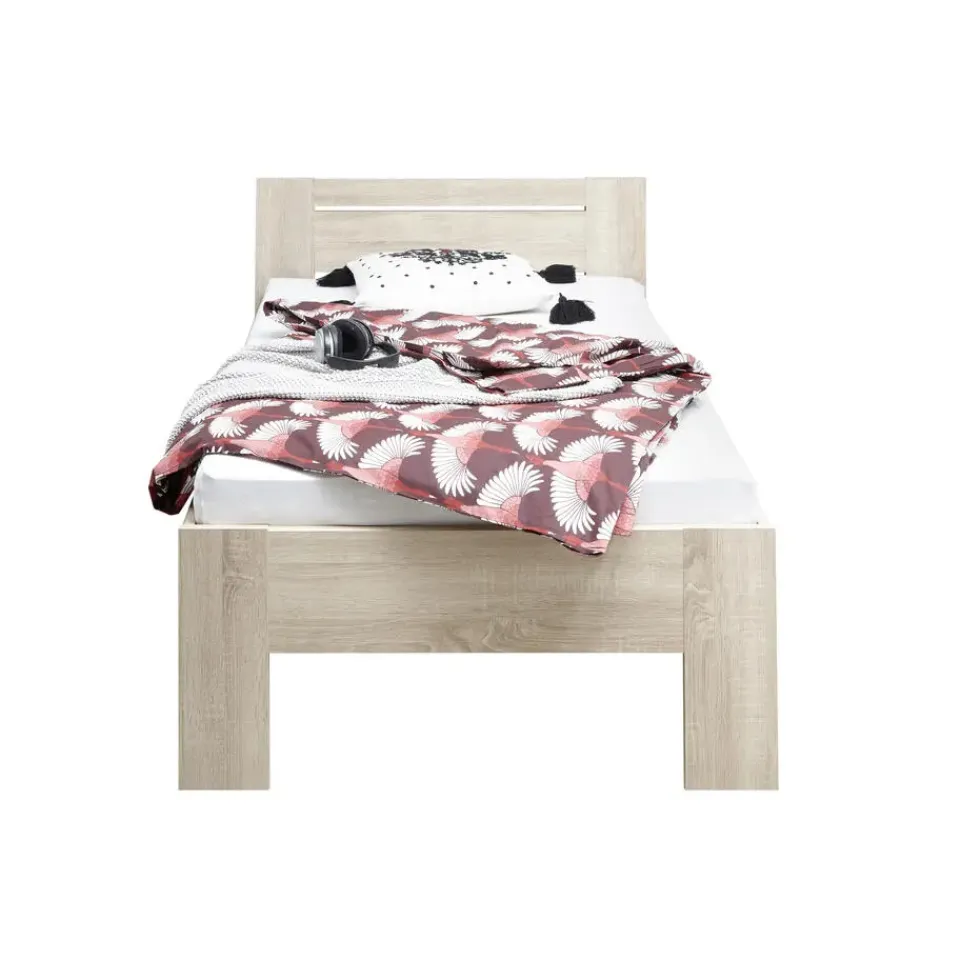 Dit eenpersoonsbed Sartre is inzetbaar in heel wat settings, zowel in de tiener-, logeer- als volwassenenkamer. Het bed is gemaakt uit spaanplaat in sonoma eikdecor en is zowel op het vlak van stijl als design gemakkelijk in elk slaapkamerinterieur te integreren. Het bed is geschikt voor een lattenbodem en matras van 90×200 en heeft een instaphoogte van ongeveer 46cm.