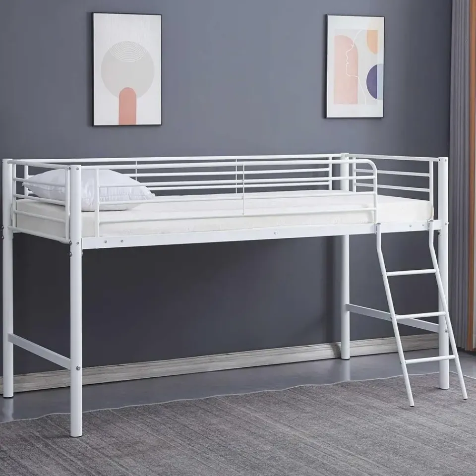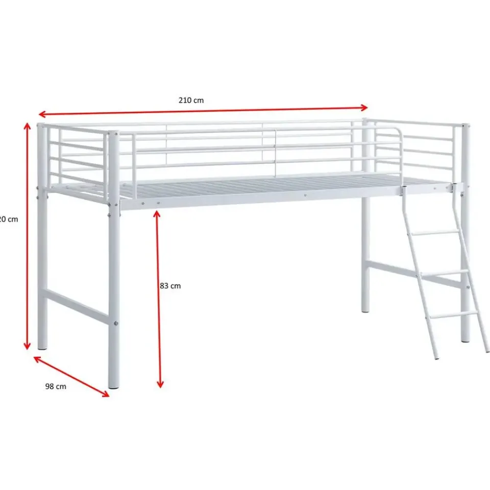 De metalen halfhoogslapers Julie combineren modern design met functionaliteit en zijn de perfecte oplossing voor kamers waar ruimtebesparing essentieel is. De metalen constructie zorgt voor stevigheid en stabiliteit en geeft de bedden een coole uitstraling. Het bed heeft een een ligoppervlak van 90x200cm en is te bereiken via een veilige ladder. Deze hoogslapers zijn geschikt voor zowel kinderen als volwassenen, waardoor ze perfect zijn voor bijvoorbeeld studentenkamers of tienerkamers. De ruimte onder het bed kan gebruikt worden als opbergruimte, of om een bureau te plaatsen. Of richt met wat kussens of poefs een plek in waar je tiener lekker kan “chillen”.