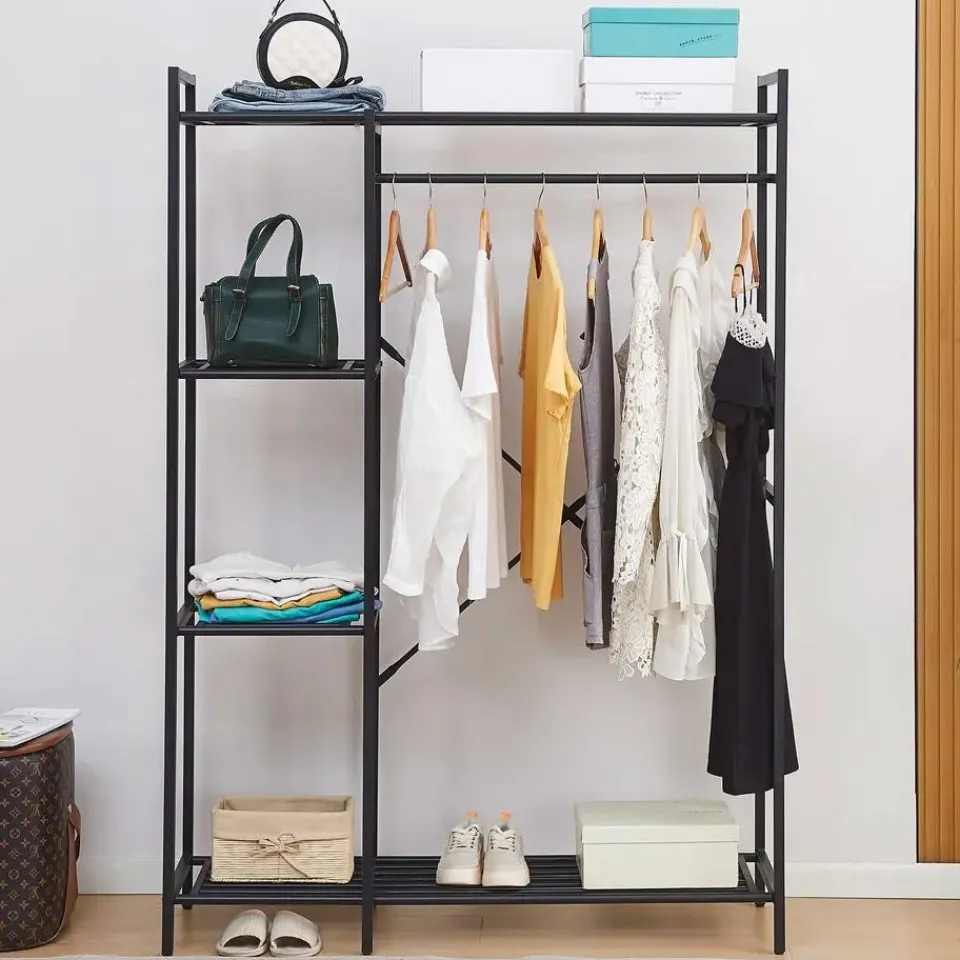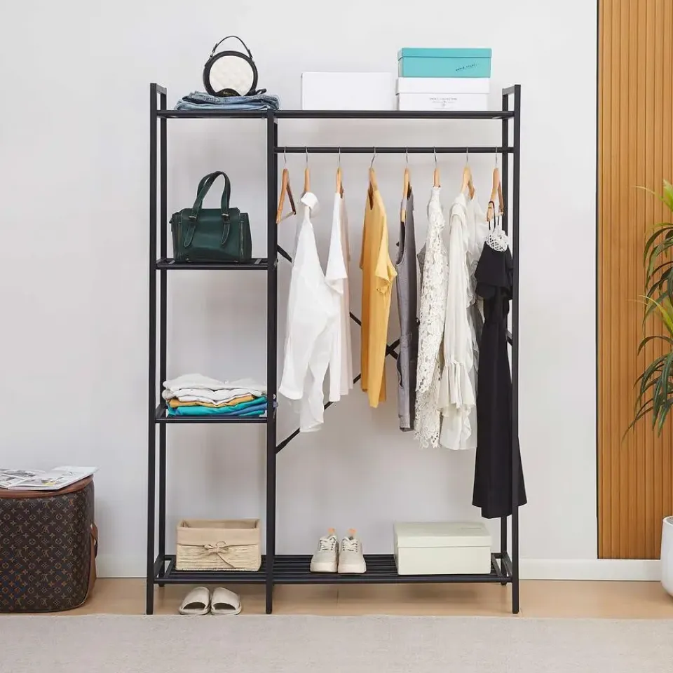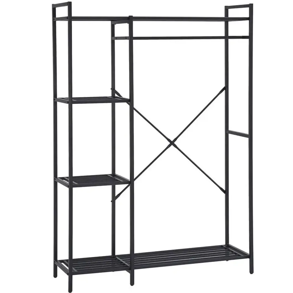 Op zoek naar een praktisch en modern kledingrek? Het Marek metalen kledingrek biedt de perfecte balans tussen functionaliteit en stijl. Met zijn stevige stalen frame en strakke zwarte afwerking is dit kledingrek een stijlvolle toevoeging aan je slaapkamer, hal of inloopkast. Het slim ontworpen rek is uitgerust met een kledingroede voor jassen, blouses en dergelijke, en vier zijplanken voor opgevouwen kleding en accessoires. Daarnaast is de onderste plank handig voor schoenen, dozen of opbergmanden. Dankzij de open structuur houd je al je kledingstukken en accessoires overzichtelijk en binnen handbereik. Ontdek de volledige collectie Marek op onze website.