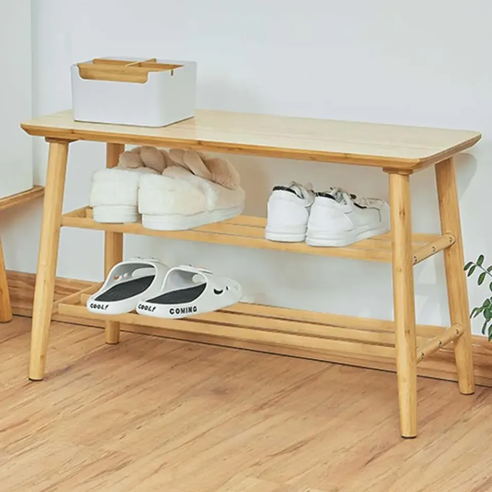 Creëer een opgeruimde en stijlvolle hal met het Reini schoenenbankje uit hoogwaardig massief bamboehout. Het bamboehout is stevig, milieuvriendelijk en vochtbestendig. Met twee ruime legplanken biedt het schoenenrek plaats aan tot 6 paar schoenen, van sneakers tot slippers. De bovenkant dient als stevige zitbank, ideaal om even op te rusten of je schoenen gemakkelijk aan te trekken. Dankzij het lichte gewicht is de Reini schoenenbank eenvoudig te verplaatsen en te combineren met andere meubels. Of je nu kiest voor een scandinavische of moderne woonstijl, dit bamboe schoenenbankje past perfect en brengt een warme, uitnodigende sfeer in huis.