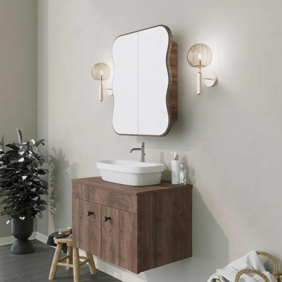Stap je badkamer binnen en laat je begroeten door de pure elegantie en verfijning van ons badkamermeubel. Het strakke ontwerp en de rijke walnootkleur(en) zullen je zintuigen direct boeien en een serene en uitnodigende sfeer creëren die je nooit meer wilt verlaten.