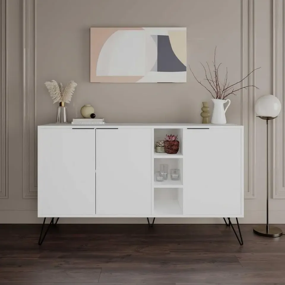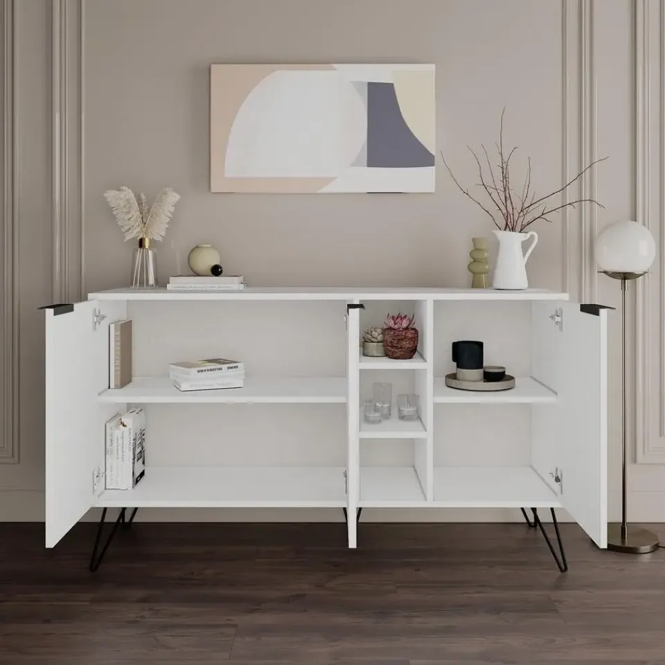 Transformeer uw woonruimte met onze prachtige moderne console, vervaardigd van 100% melamine gecoat spaanplaat voor duurzaamheid en stijl. Het slanke ontwerp en de witte kleur maken het een veelzijdig meubelstuk dat elke kamer in uw huis zal verfraaien.