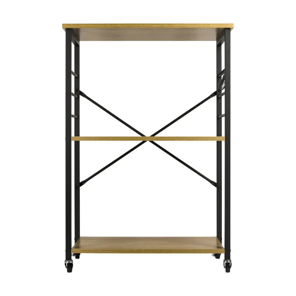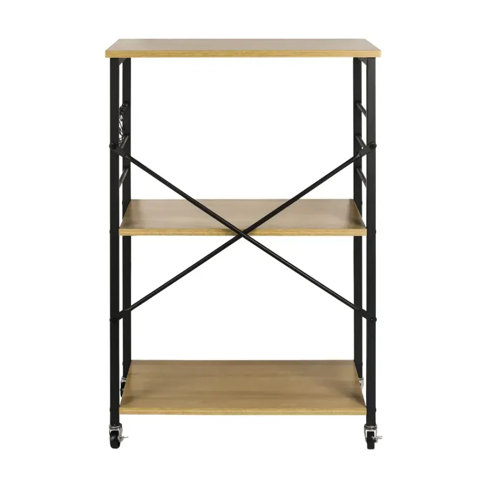 De ERRO keukentrolley is een handige en stijlvolle opbergoplossing voor elke keuken. Met drie ruime planken biedt deze serveerwagen voldoende opbergruimte voor keukengerei, ingrediënten en zelfs keukenapparaten. Dankzij de wieltjes met remfunctie verplaats je de trolley moeiteloos door de keuken, of gebruik je hem als vast keukenrek op wielen. De serveerwagen heeft een zwart metalen frame en stevige planken van spaanplaat.