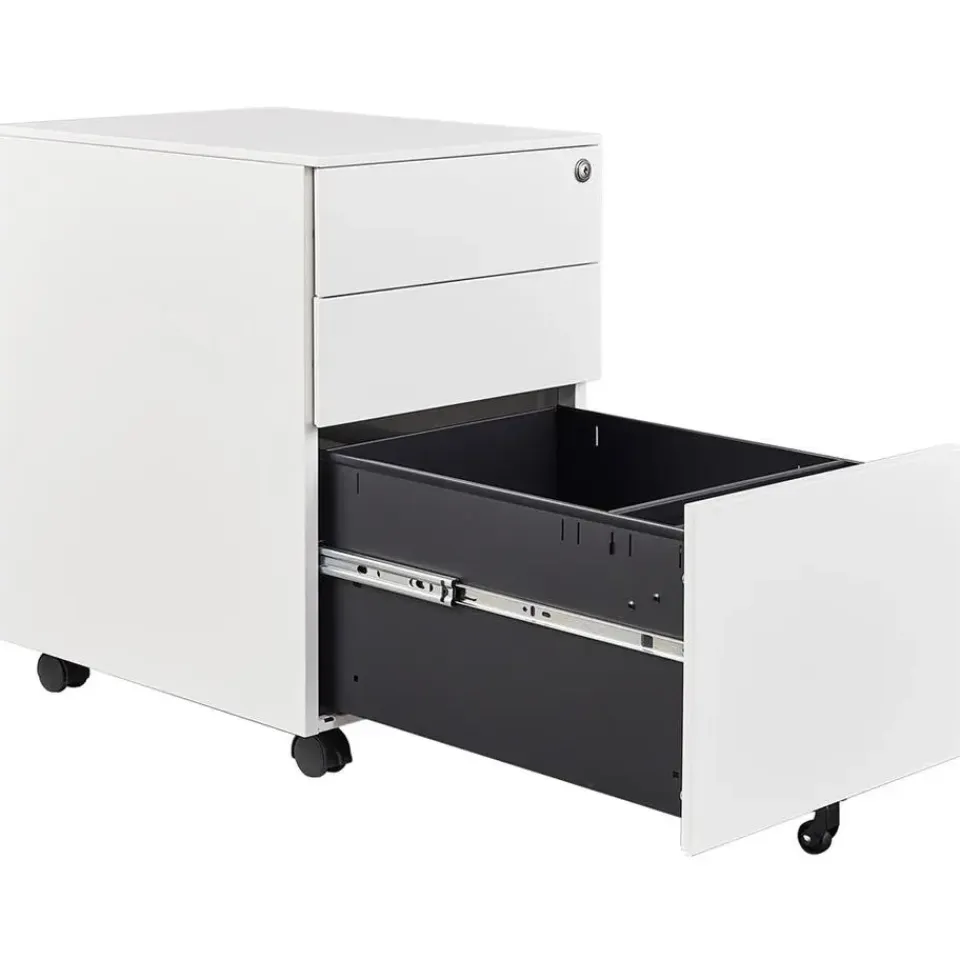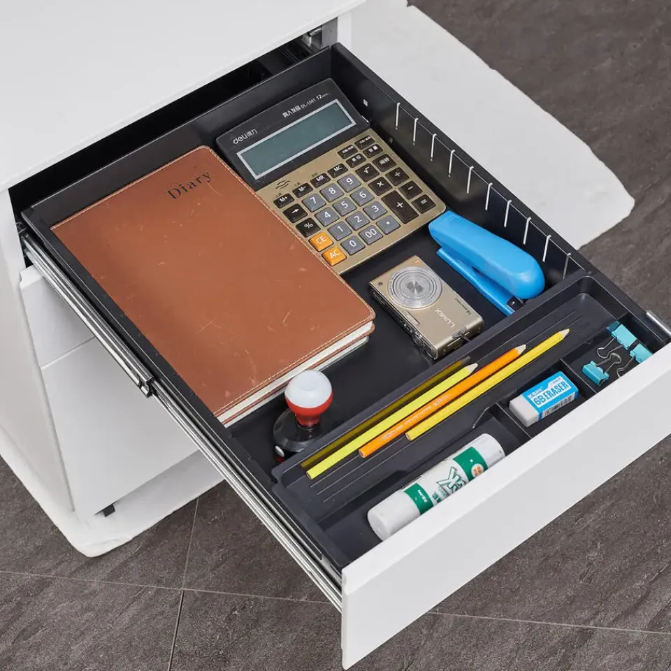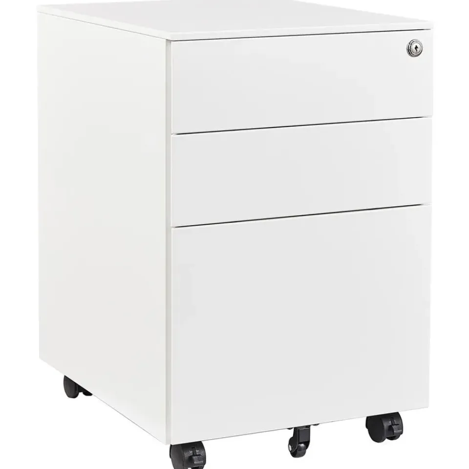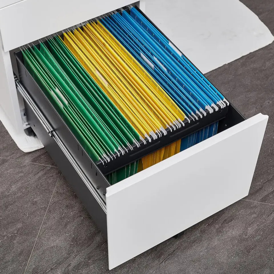 Hoewel tegenwoordig veel digitaal is, heb je toch nog papierwerk, schrijfmateriaal en andere accessoires nodig tijdens het werk. Deze bureaukast is voorzien van 3 lades, waarvan 1 archieflade en 1 lade met een slot. De bovenste lade is afsluitbaar door een unieke sleutel. Zo berg je gemakkelijk al jouw waardevolle items op. De tweede lade kun je gebruiken voor al jouw schrijfmaterialen en andere accessoires. De onderste lade is voorzien van een rek, waaraan je hangmappen kan hangen.