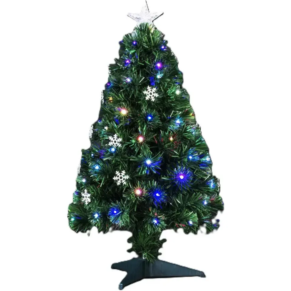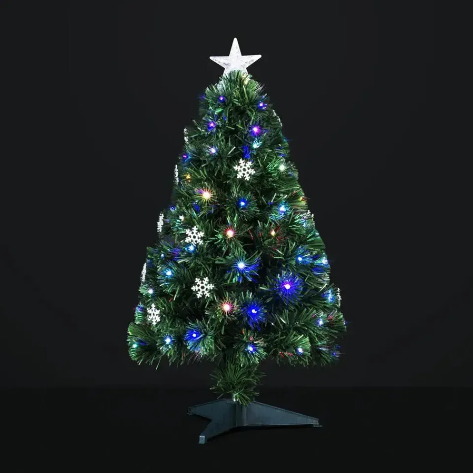 Fiber optic kerstboom/kunstboom met 74 LED lampjes/lichtjes en een verlichte ster piek. Met zijn compacte formaat van 90 cm is deze kerstboom perfect voor kleine ruimtes, kantoren of als aanvulling op je bestaande kerstdecoratie. Deze prachtige kerstboom is voorzien van fiber optic verlichting met wisselende kleuren, waardoor hij een betoverende gloed uitstraalt die elke hoek van je huis oplicht. Met een piek bovenop voegt deze kerstboom een finishing touch toe aan je feestelijke decoratie, waardoor hij direct klaar is om bewonderd te worden. De boom wordt geleverd met 74 LED lampjes en een type E transformator.