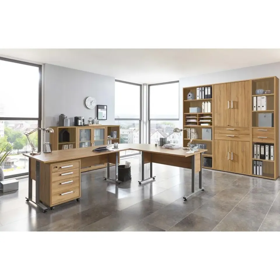 Dit stijlvolle meubeltje mag niet ontbreken in jouw kantoor! Ladeblok Gabi is vervaardigd uit spaanplaat en heeft een decor van oude eik. Het kastje telt 4 handige lades waarin je allerlei kantoorartikelen kan opbergen. Dankzij de wielen kan je het bovendien makkelijk verplaatsen. Je kan het ladeblok combineren met de bijpassende kantoormeubelen van de collectie Gabi, maar dankzij zijn neutrale look past het ook goed bij andere meubelen.