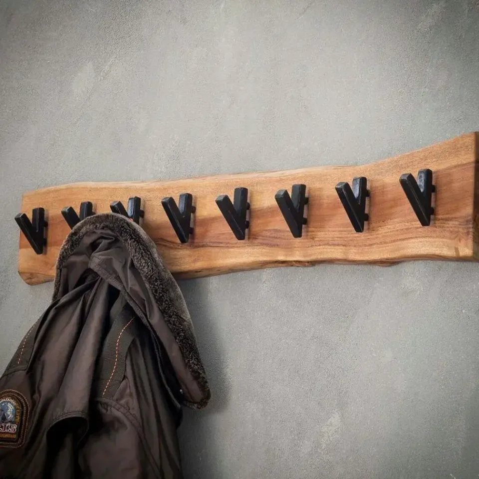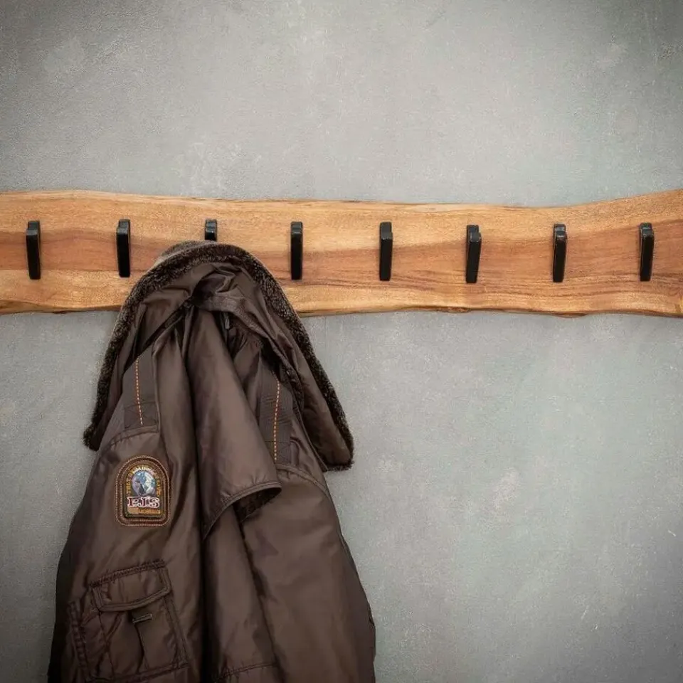 Maak uw hal of slaapkamer helemaal af met deze natuurlijke en rustieke Carter wandkapstok! Deze kapstok is gemaakt van stevig massief acaciahout en is voorzien van een fijne nerf en verschillende noesten, waardoor hij zijn unieke uitstraling krijgt. De stoere haken zijn gemaakt van zwart geschuurd metaal en vormen een mooi contrast met het hout. Dit model heeft 8 haken, maar hij is ook verkrijgbaar met 5, 2×6 of 2×3 haken. Tevens is hij verkrijgbaar in een variant met hoedenplank met en zonder haken.