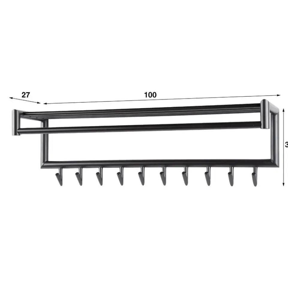 Deze kapstok heeft een ronde buis, uitgevoerd in donkergrijs mat gepoedercoat staal. De hoedenplank bestaat uit meerdere van deze ronde buizen en in totaal heeft dit model 10 gelaste haakjes. Deze kapstok kan door middel van twee bevestigingspunten eenvoudig aan de wand worden gemonteerd. Deze kapstok heeft ook een 20- haaks uitvoering.