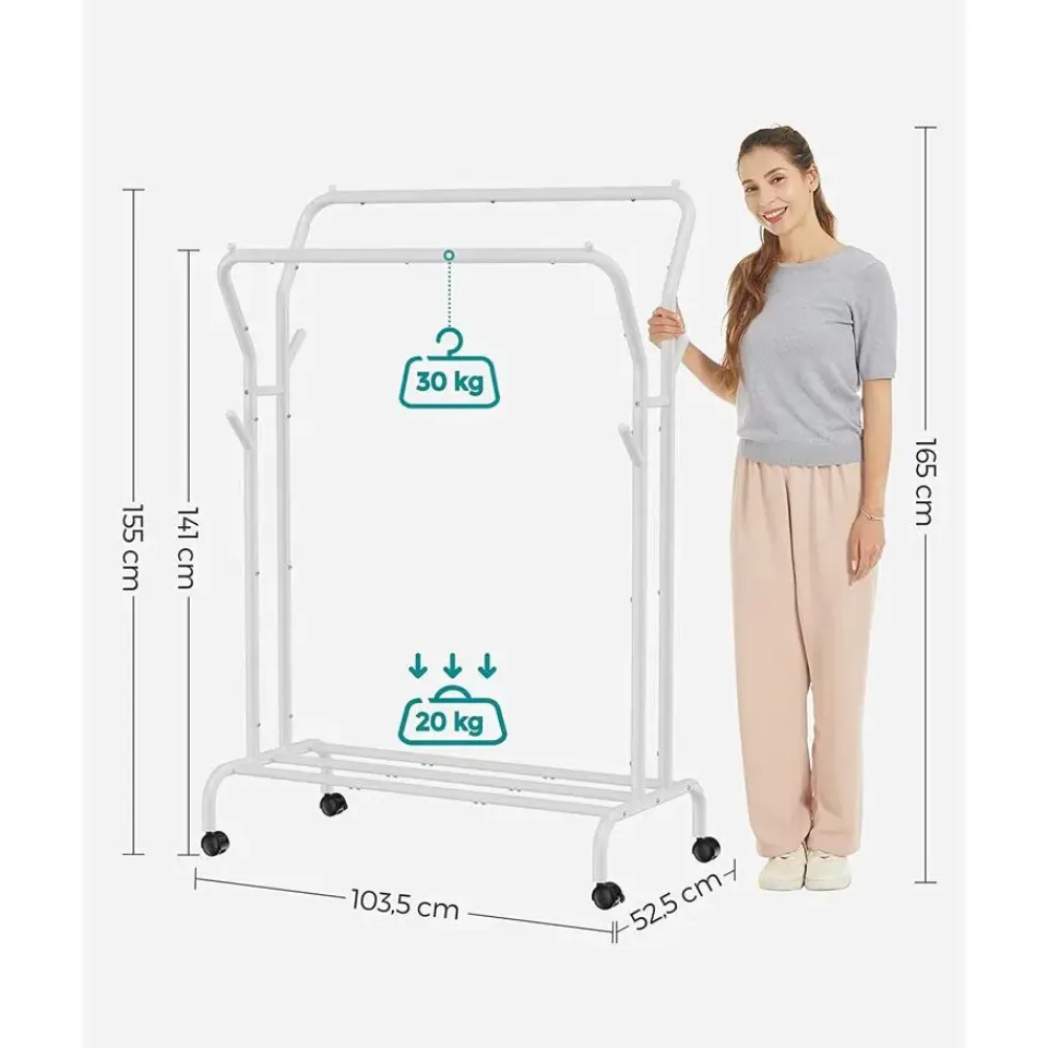 [Veelzijdige opslag] Met een hoge rail en een lage rail voor het ophangen van kleding van verschillende lengtes, haken aan beide zijden voor tassen en hoeden, en een onderste plank voor dozen en schoenen, houdt dit kledingrek al je benodigdheden op één plek [Sneldrogend en gemakkelijk toegankelijk] De afstand van 42 cm tussen 2 kledingophangrails zorgt ervoor dat de lucht gemakkelijk doorstroomt, wat een snelle droging bevordert. Het biedt voldoende ophangruimte om overvolle, rommelige kleding te voorkomen, waardoor ze gemakkelijker toegankelijk zijn [Gemakkelijk te verplaatsen en te vergrendelen] Schuif de dubbele kledingroede moeiteloos naar elke kamer in huis dankzij de 4 zwenkwielen. 2 van de wielen zijn vergrendelbaar, waardoor je het rek ook op één plek kunt bewaren [Stabiel en sterk] Met bouten die de 25,4 mm dikke stalen buizen bevestigen, heeft dit kledingrek een stabiel frame dat tot 100 kg kan dragen. Elke rail heeft een max. statisch draagvermogen van 30 kg; elke haak tot 5 kg; en de onderste plank kan maximaal 20 kg dragen [Eenvoudige montage] De eenvoudige structuur, de genummerde onderdelen en de geïllustreerde, gemakkelijk leesbare instructies maken het opzetten van dit robuuste kledingrek een fluitje van een cent.