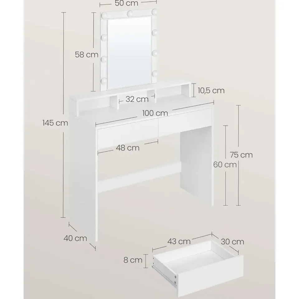 De zijwanden zijn verstevigd met een plaat aan de achterkant die een stabiele structuur creëert zonder dat de kaptafel begint te wiebelen bij elke beweging die je maakt of wanneer er iets op wordt gezet. Bovendien is er ook nog eens genoeg ruimte links en rechts om al je cosmetische producten neer te zetten. De verlichting kan worden ingesteld naar de gewenste helderheid, waardoor je altijd goed geïnformeerde beslissingen over jouw make-up kunt nemen.