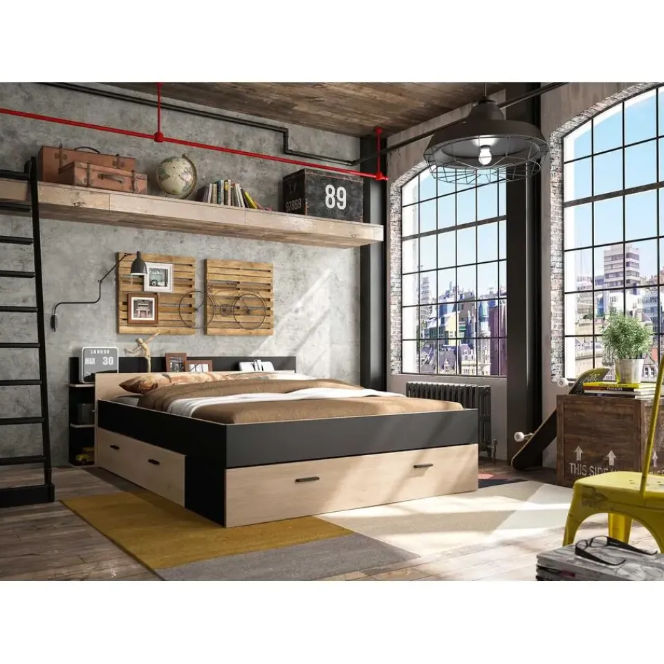 Dit bed meet 160 bij 200 cm en heeft een stoere afwerking in kastanjehout en zwart. Een bijpassende matras en lattenbodems kun je uitkiezen in de webshop.