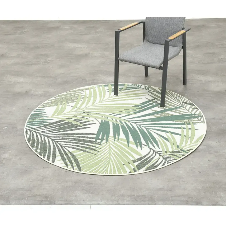 Het Naturalis Palm Leaf buitenkleed heeft een opvallend design met palmbladeren, gewoven in verschillende kleuren groen. Een prachtig vloerkleed voor buiten waarmee je een unieke look in jouw tuin, op jouw terras of op jouw balkon creëert. De ronde vorm maakt dit buitenkleed ideaal voor bijvoorbeeld onder een ronde tuintafel, balkonsetje of hang ei. Het kleed heeft een doorsnede van 160 cm en is gemaakt van polypropyleen. Een hoogwaardige en onderhoudsvriendelijke kunststof met verhoogde UV-resistentie. Hierdoor verkleurt het kleed niet of nauwelijks en is het uitstekend geschikt voor buiten. Natuurlijk kan het kleed ook prima binnenshuis gebruikt worden en voelt het bovendien heerlijk zacht aan je voeten. Het buitentapijt is eenvoudig schoon te houden met de stofzuiger. Vlekken kun je het beste behandelen door deze voorzichtig schoon te deppen met een vochtige doek. Het buitenkleed is hitte- en vuurbestendig. Naast deze ronde variatie is het Naturalis Palm Leaf buitenkleed ook verkrijgbaar in rechthoekige vorm, in de maten 120 cm bij 170 cm, 160 cm bij 230 cm en 200 cm bij 290 cm.