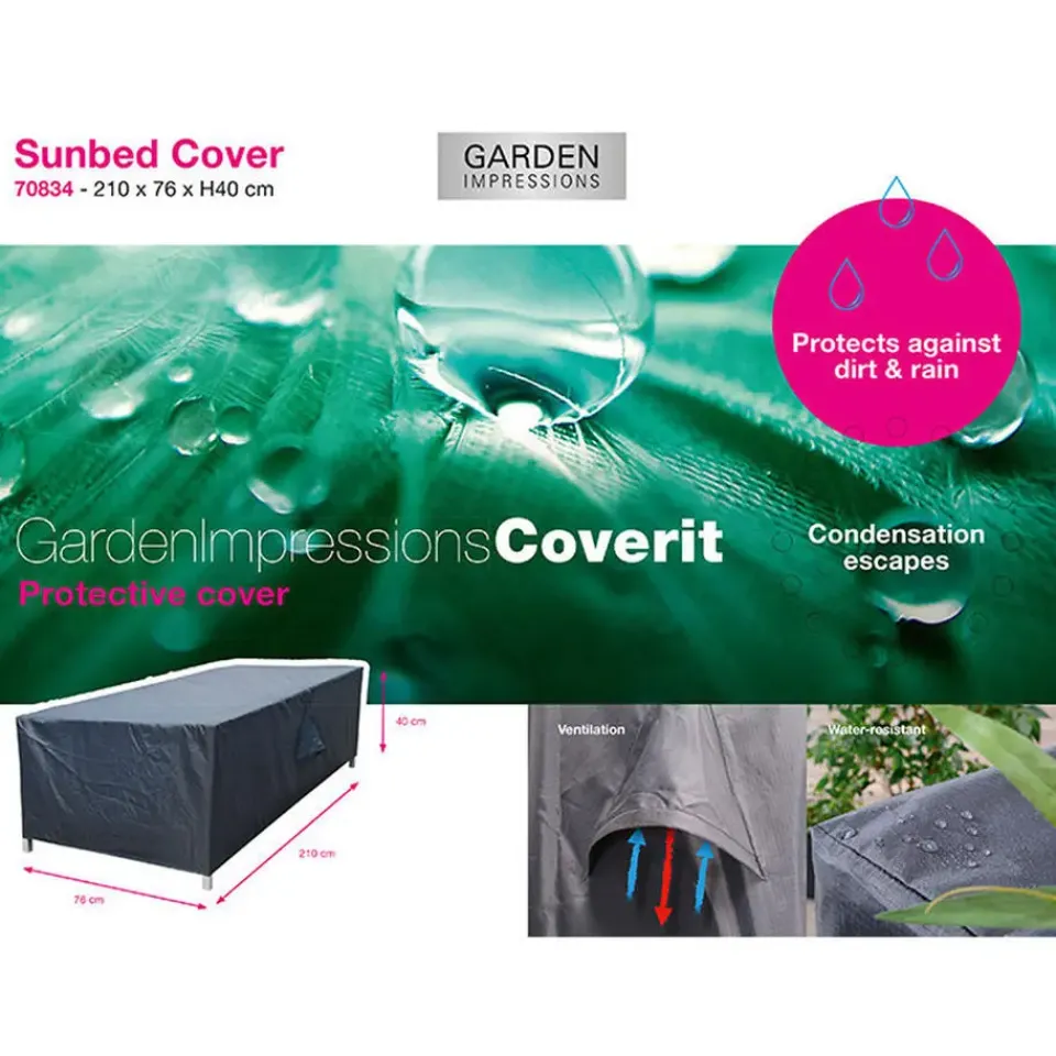 Ben je op zoek naar een beschermhoes voor jouw ligbed? Deze prettige beschermhoes van kwaliteitsmerk Garden Impressions zorgt ervoor dat je langer plezier zal hebben van jouw tuinmeubelen. Om de levensduur van je tuinmeubelen te verlengen, raden wij aan om deze af te dekken in de wintermaanden. De beschermhoezen van Garden Impressions zijn gemaakt van hoogwaardig polyester met een ademende coating. Deze coating zorgt ervoor dat hoes waterbestendig is. De hoes is niet volledig waterdicht, maar waterafstotend. Het is een flexibele ademende coating, waardoor de hoes in de wintermaanden ook nog flexibel blijft. Doordat de hoes niet volledig waterdicht is, is aan te raden om een afstand te creëren tussen het tuinmeubel en de hoes. Het water kan er dan gemakkelijker afstromen en het tuinmeubel kan niet verstikken. De beschermhoes is voorzien van ventilatie driehoeken zodat het tuinmeubel kan ademen. De hoes kan gemakkelijk om de ligbed worden bevestigd. Op alle hoeken zit onderaan een elastieken band om de hoes strak te houden. We raden je aan om de kussen niet onder de hoes te laten liggen. Mocht de kussens al nat zijn geworden, is dat niet erg maar zorg er wel voor dat ze droog worden opgeborgen. De beschermhoes voor ligbed met afmeting 210x76xH40 cm.