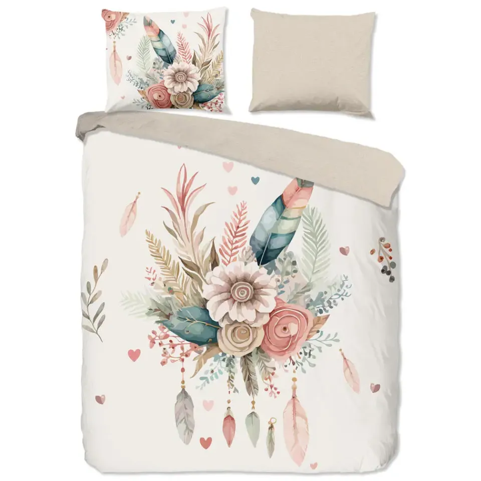 Dekbedovertrek Videl van Good Morning met bloemen en veren, in de kleur ecru. Dit is gemaakt van 100% katoen. De kwaliteit is ademend, vochtabsorberend en voelt zacht en soepel aan. Dit mooie dekbedovertrek fleurt iedere slaapkamer op en is geschikt voor elk jaargetijde. Het katoenen dekbedovertrek is heerlijk koel in de zomer en geeft warmte in de winter.