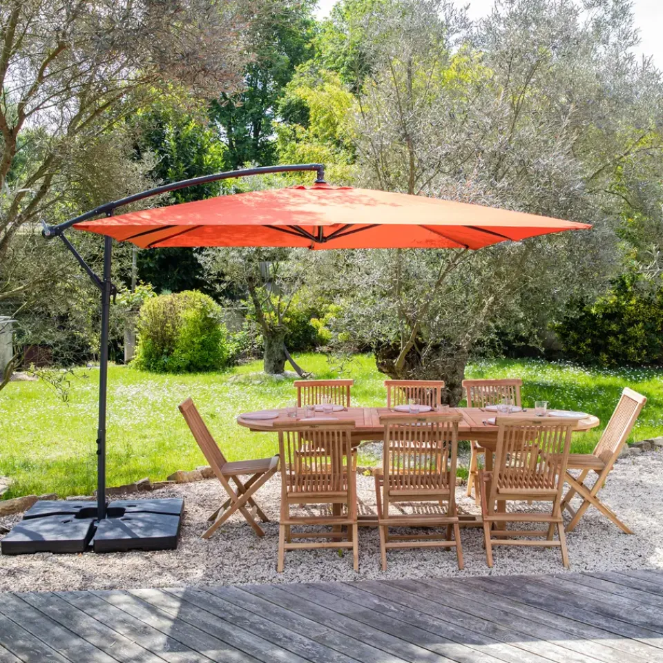 Plaats je MOLOKAI gedeporteerde parasol waar je maar wilt, afhankelijk van de stand van de zon, voor optimale bescherming de hele dag lang. Zijn spanwijdte bedekt de hele tafel zodat iedereen kan genieten van een gezellig moment zonder last te hebben van het licht. Qua design geeft de scharnierende paal hem een heel eigentijdse look. De mooie combinatie van kleuren tussen de mast en de parasolhoes geeft je buiteninrichting een elegant accent. Deze offset parasol past perfect bij elke tuinsalon. Maak je off-centre parasol compleet met een set ballastplaten om hem op zijn plaats te houden tijdens gebruik. Bekijk ze in onze catalogus.