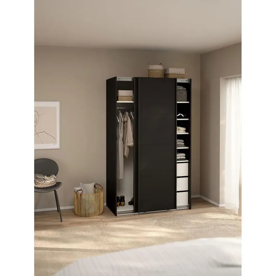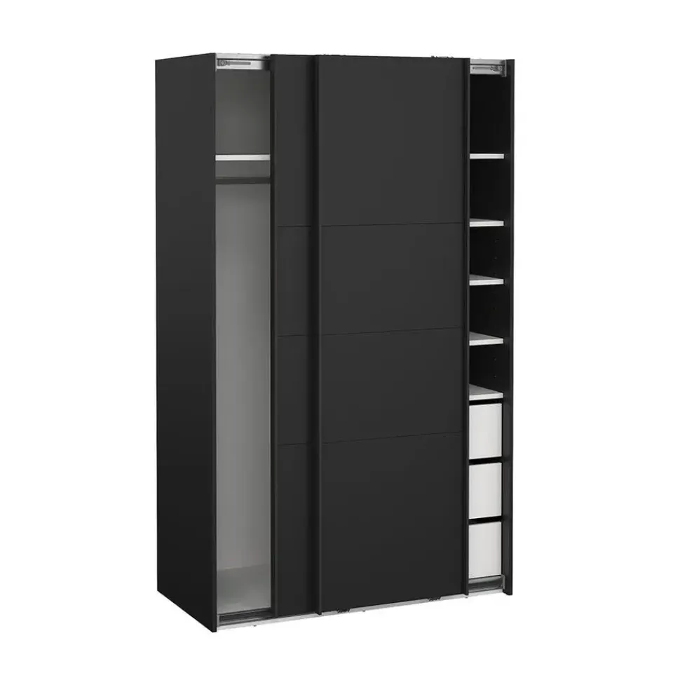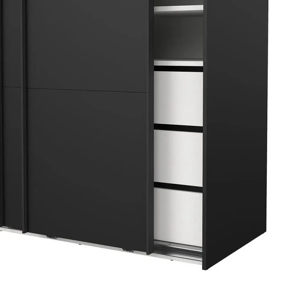 De Catania schuifdeurkast in matzwart is een compacte en stijlvolle oplossing voor moderne woningen waar de ruimte optimaal benut moet worden. Met zijn afmetingen van 120×200 cm past de kast perfect in kleinere slaapkamers, gangen of tienerkamers, zonder in te leveren op functionaliteit. De twee schuifdeuren schuiven soepel en nemen geen extra ruimte in beslag vóór de kast – ideaal voor smalle ruimtes. De matzwarte afwerking zorgt voor een exclusieve en tijdloze uitstraling die perfect te combineren is met zowel lichte als donkere interieurkleuren. Binnenin is de kast voorzien van zowel een kledingroede als planken, wat zorgt voor veel opbergruimte.