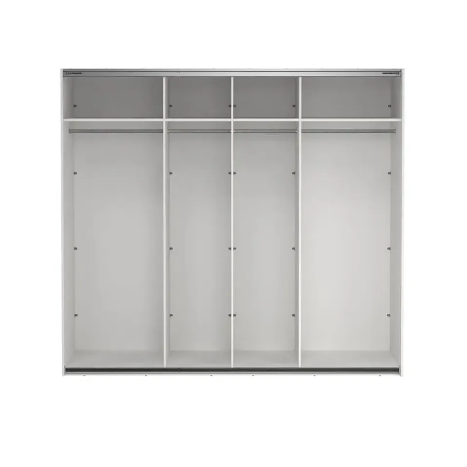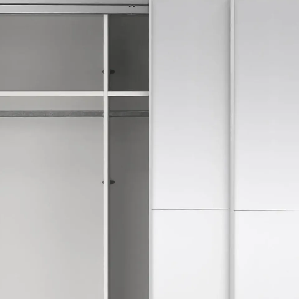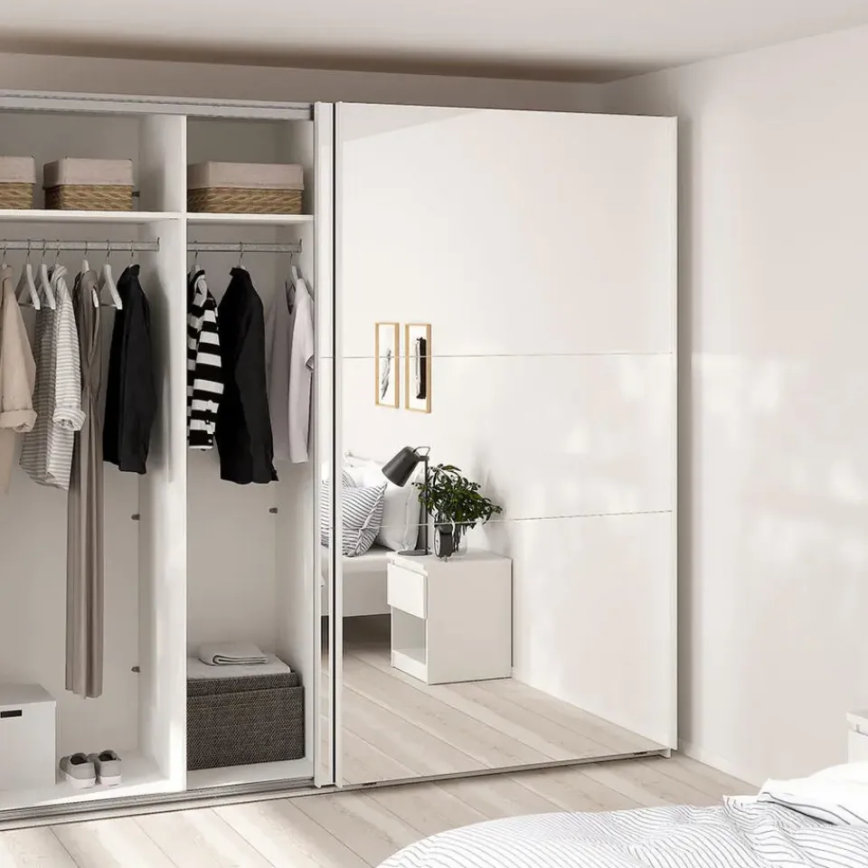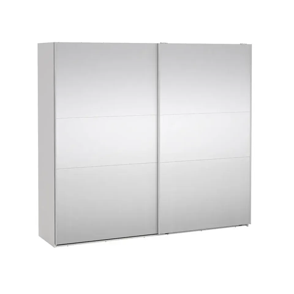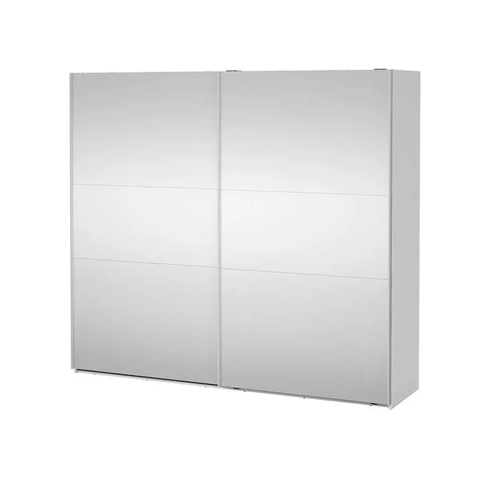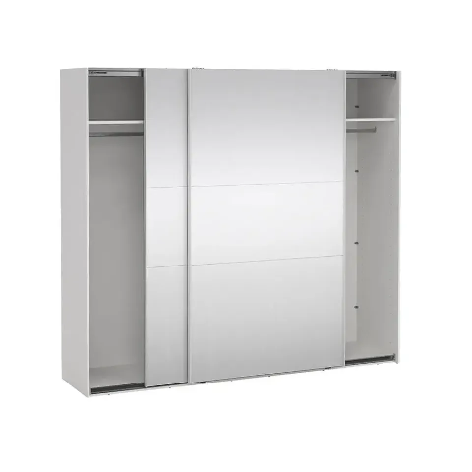 De Como schuifdeurkast in wit met spiegeldeuren is de perfecte keuze voor wie zowel functionaliteit als elegantie in de slaapkamer wenst. Met een breedte van 245 cm krijgt u extra opbergruimte – ideaal voor een grote kledingkast. De twee schuifdeuren schuiven soepel en nemen geen extra vloeroppervlak in beslag, waardoor de kast zelfs in smalle ruimtes geschikt is. De grote spiegelvlakken op beide deuren maken het gemakkelijk om de outfit voor de dag te kiezen en creëren tegelijkertijd een gevoel van meer licht en lucht in de kamer. Het witte oppervlak zorgt voor een tijdloze look die in de meeste huizen past.