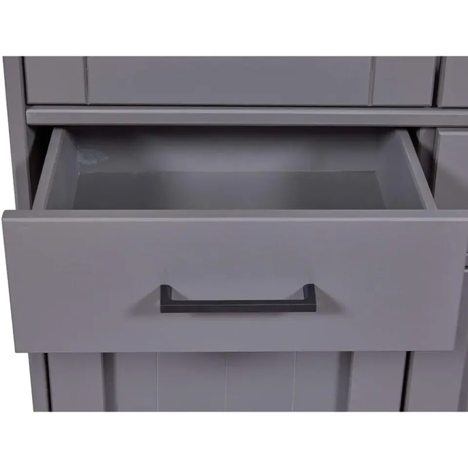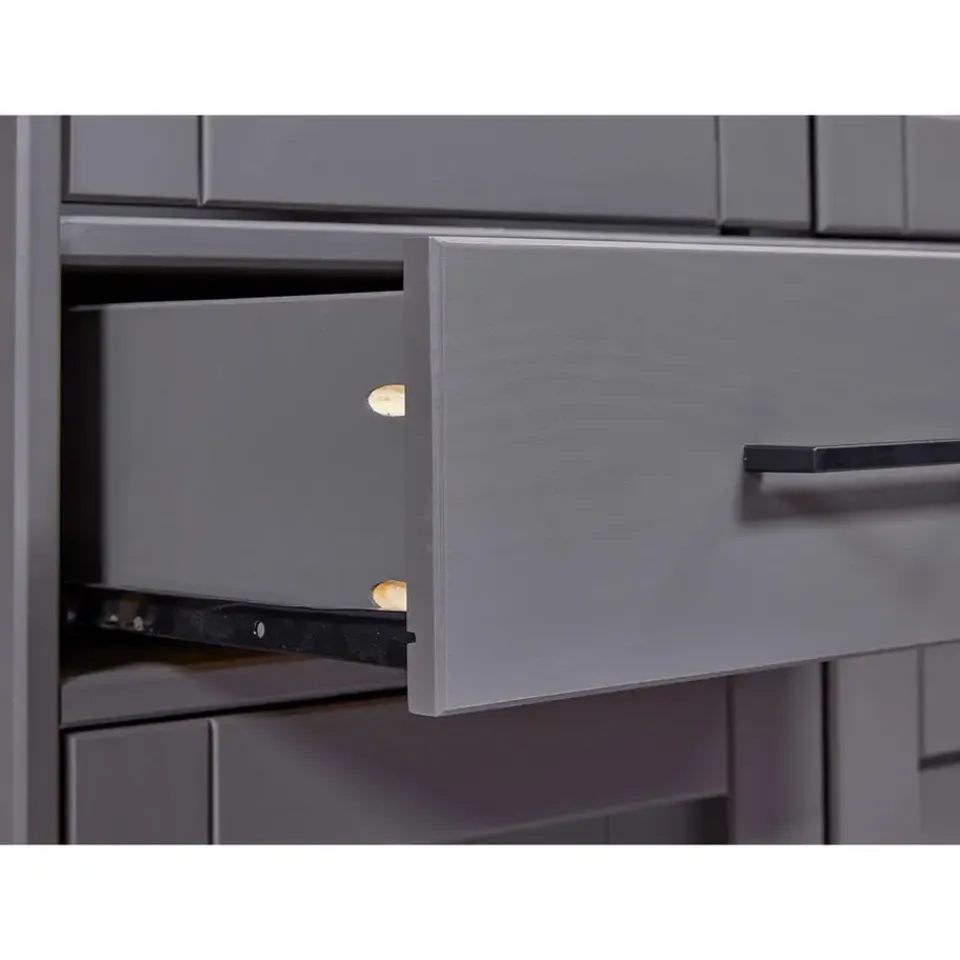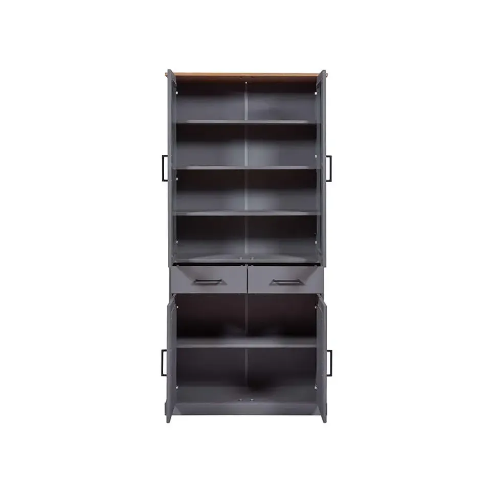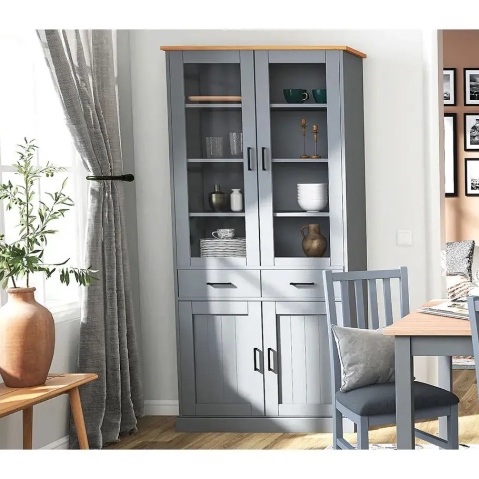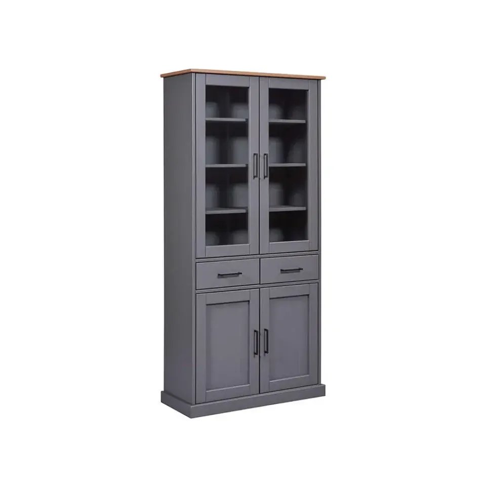 Forenzo vitrinekast 4 deuren, 2 lades grijs, naturel. De Forenzo vitrinekast is een elegante en functionele opbergoplossing die tijdloos design combineert met functionaliteit. Met zijn vier deuren en twee ruime lades biedt hij voldoende ruimte voor het opbergen en tentoonstellen van je favoriete spullen. Het bovenste gedeelte met glazen deuren maakt het gemakkelijk om serviesgoed, boeken of decoratieve voorwerpen tentoon te stellen, terwijl het onderste gedeelte met massieve deuren zorgt voor discrete opslag. Het mooie contrast van de kast tussen het warme blad en de grijze afwerking maakt hem tot een stijlvolle keuze voor zowel klassieke als moderne woningen. De Forenzo vitrinekast is het ideale meubelstuk om met elegantie orde te scheppen.