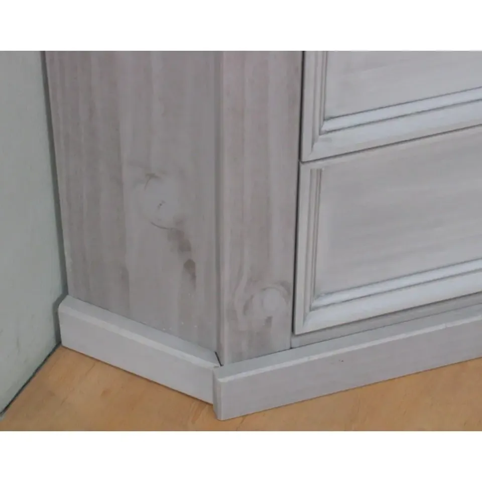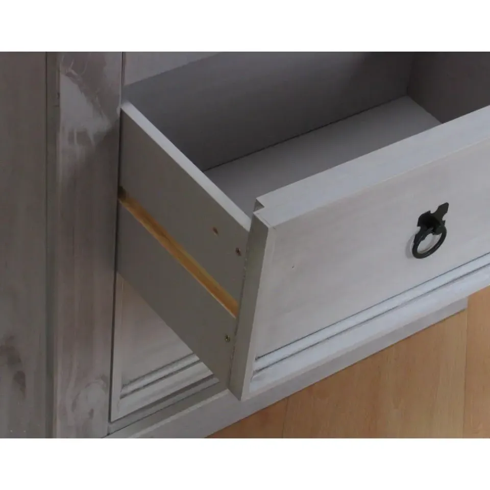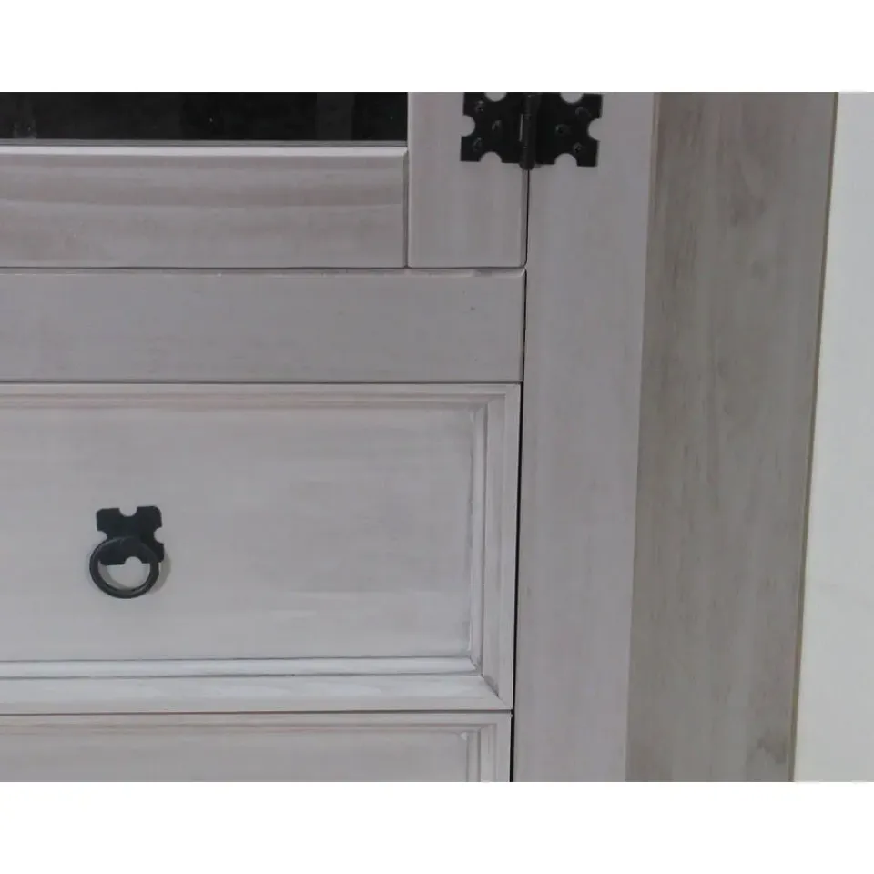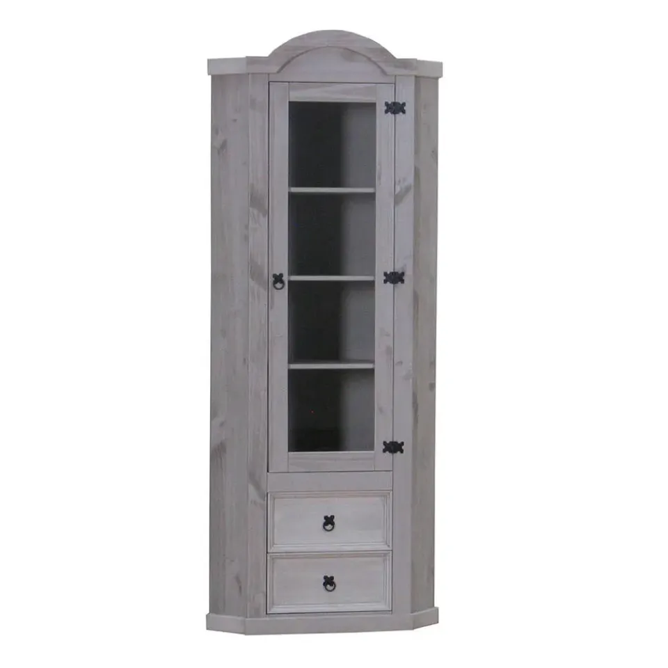 New Mexico hoekkast met 1 glazen deur en 2 lades in grijs is een vitrinekast in nan-kleur, die zowel stijl als functionaliteit in uw huis brengt. Leuke, rustieke hoekkast in grijze antieke stijl. De kast is gemaakt van massief grenenhout dat grijs is gewaxt, waarbij de houtstructuur door de grijze kleur heen zichtbaar is. Achter de deur vind je 3 losse planken. Dit product is gemaakt met oog voor detail, wat zowel esthetische aantrekkingskracht als hoge duurzaamheid garandeert. Het is ontworpen met zowel functionaliteit als stijl in gedachten, waardoor het de perfecte keuze is voor elke kamer in uw huis. De gebruikte materialen zijn van hoge kwaliteit, waardoor het product een lange levensduur heeft en bestand is tegen dagelijks gebruik. Of het nu voor opslag is of als decoratieve toevoeging, dit product zal uw interieur naar een hoger niveau tillen en extra comfort en elegantie in uw huis brengen.