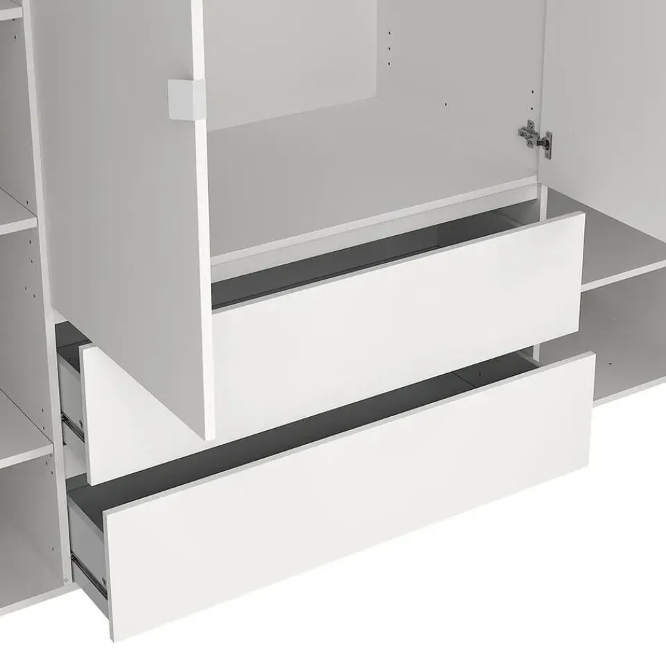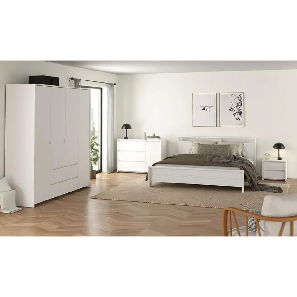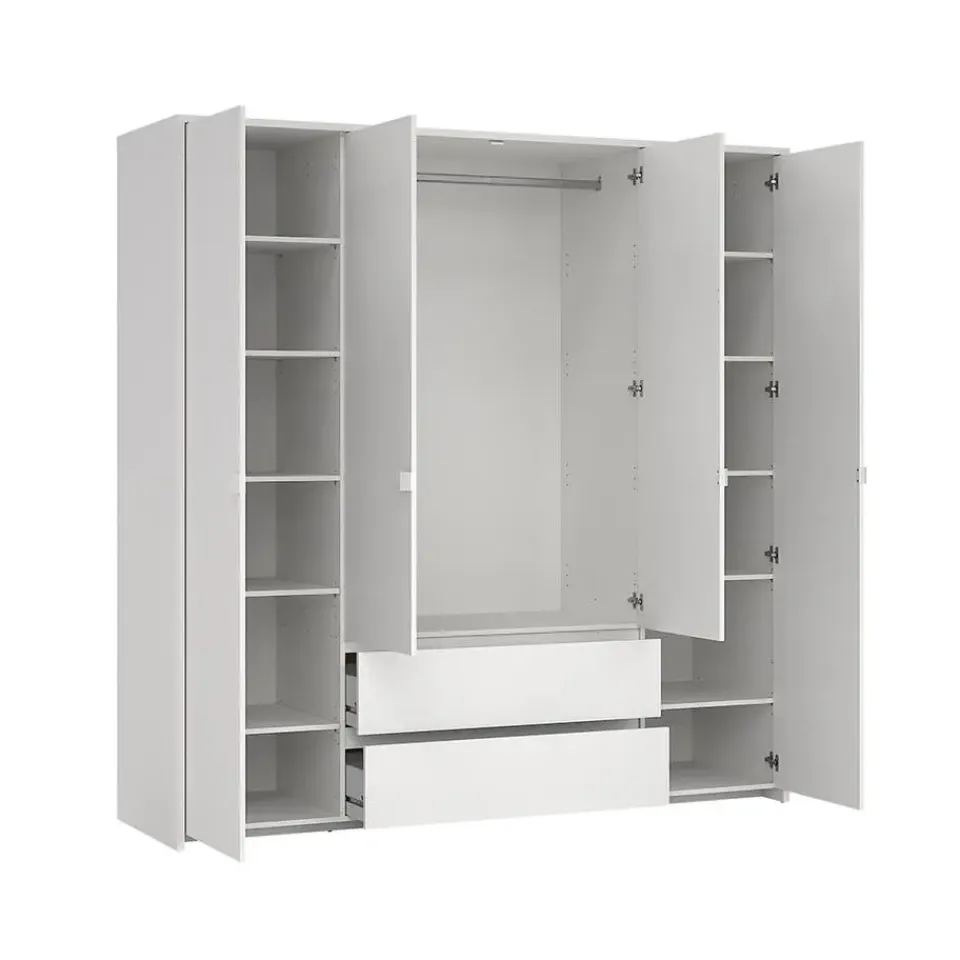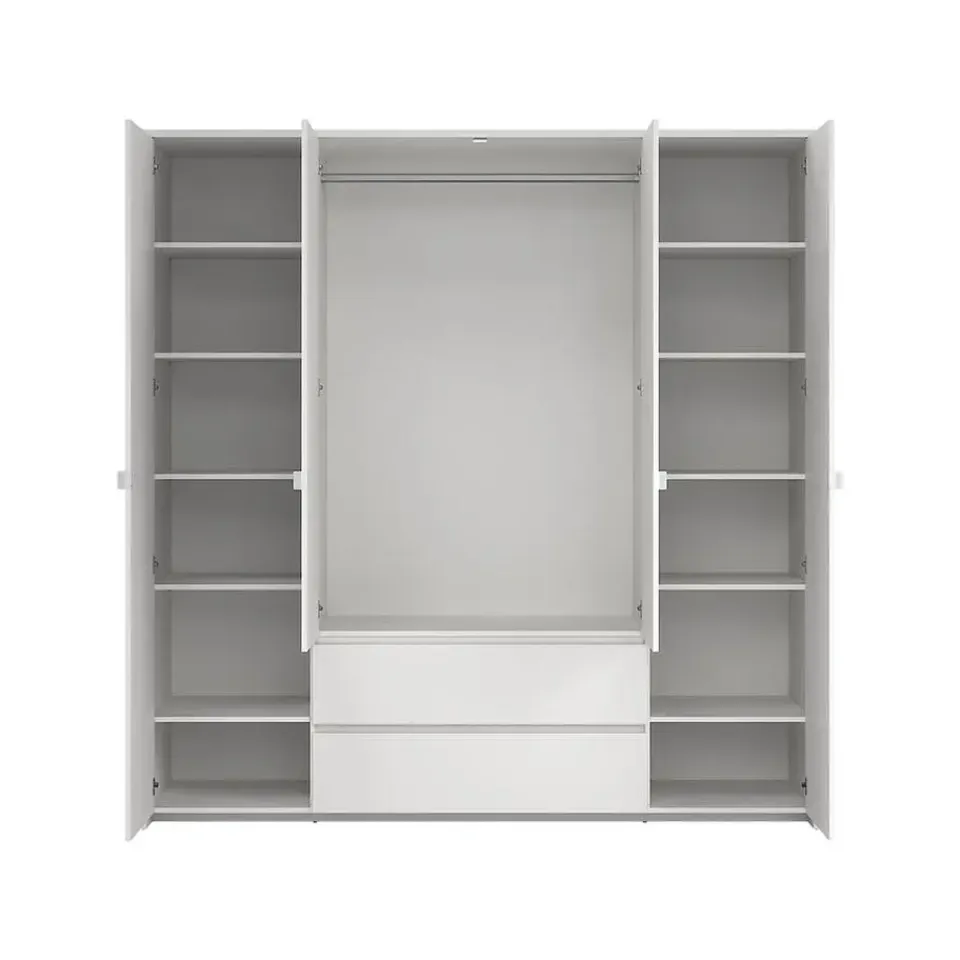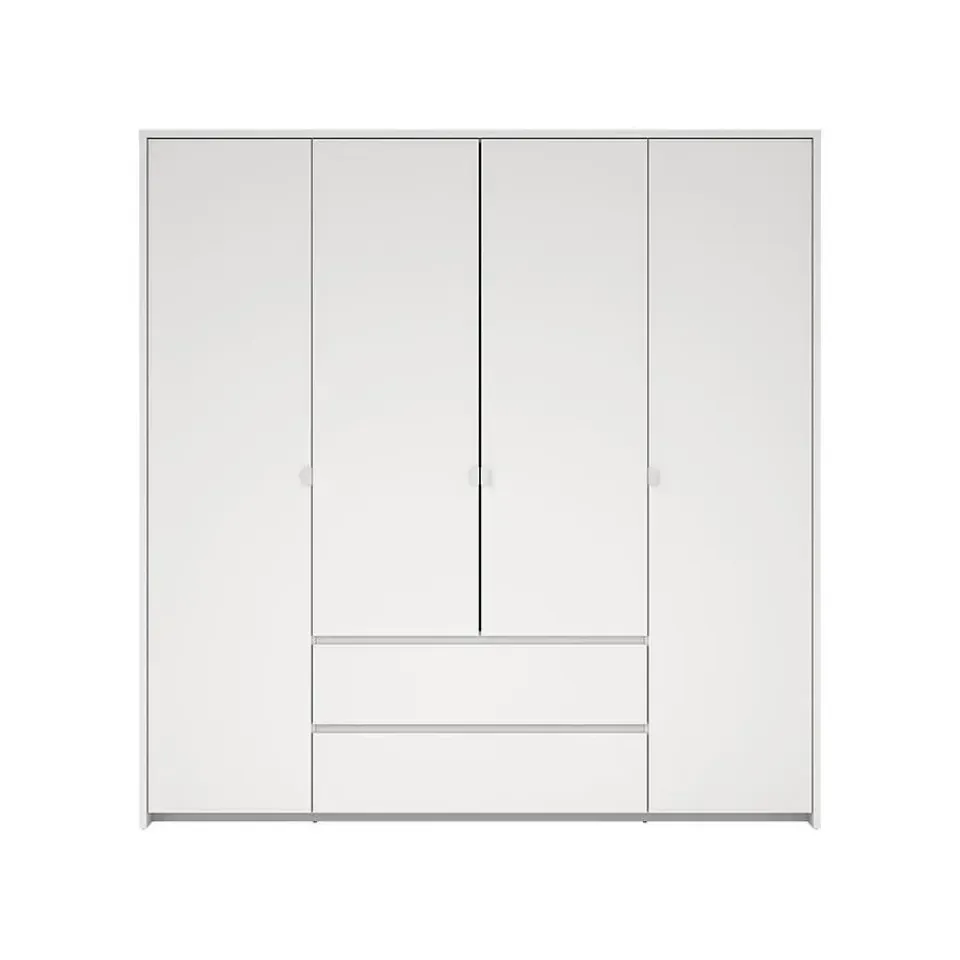 De Next garderobekast is de ideale oplossing voor wie stijl én functionaliteit in zijn garderobe zoekt. Met maar liefst vier deuren en twee grote lades creëert u volop opbergruimte, zodat kleding, schoenen en accessoires eenvoudig en overzichtelijk opgeborgen kunnen worden. Het brede model van 197 cm en de hoogte van 200 cm maken het mogelijk om de ruimte optimaal te benutten, terwijl het witte, eenvoudige design een strakke en tijdloze uitstraling in de kamer creëert. De discrete handgrepen en gladde fronten dragen bij aan de minimalistische look, die zich moeiteloos aanpast aan verschillende woonstijlen – van moderne slaapkamers tot functionele logeerkamers.