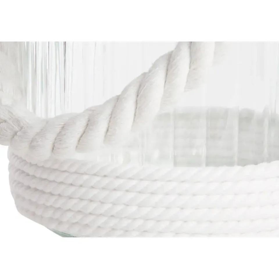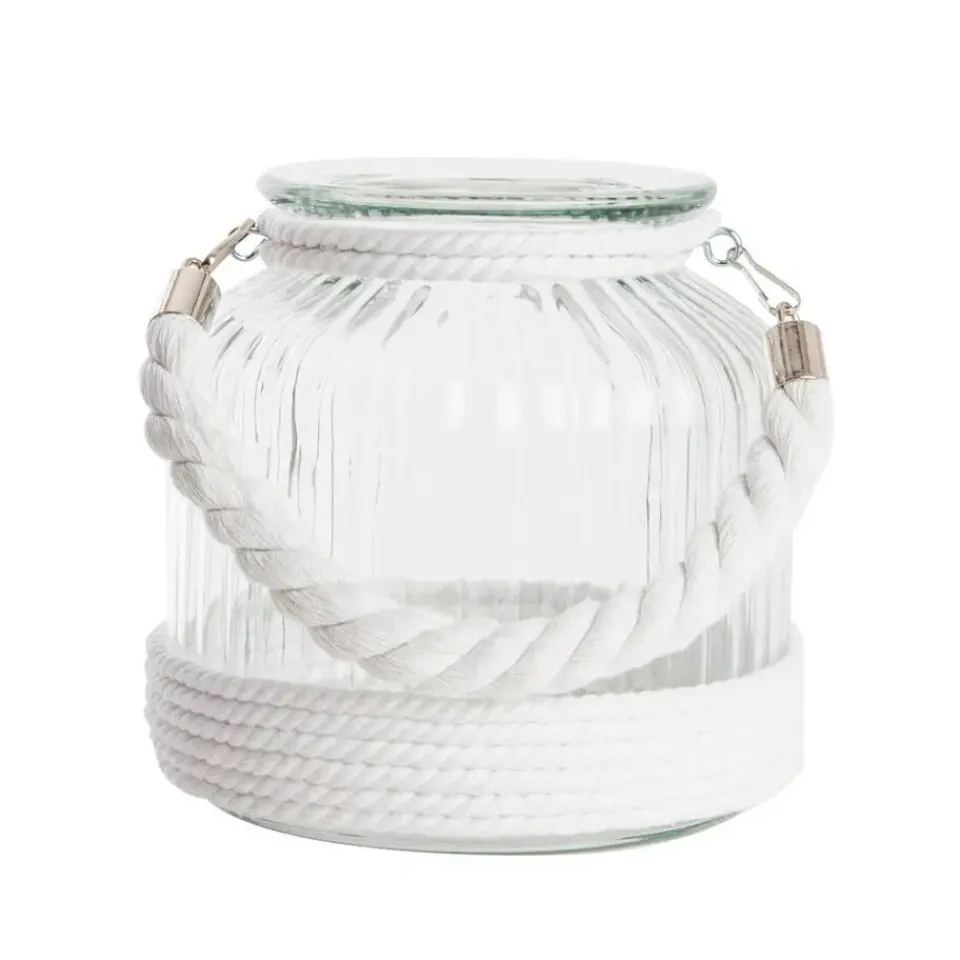 Wit glazen windlicht met touw – diameter 18 cm, hoogte 18 cm*Deze decoratieve kaarshouder is gemaakt van glas en heeft een wit touw als handvat voor een natuurlijke uitstraling. Met een diameter en hoogte van ongeveer 18 cm is het windlicht geschikt voor waxinelichtjes, stompkaarsen, theelichtjes en kleine kaarsjes. Een sfeervol accessoire dat warmte en gezelligheid brengt in jouw interieur.