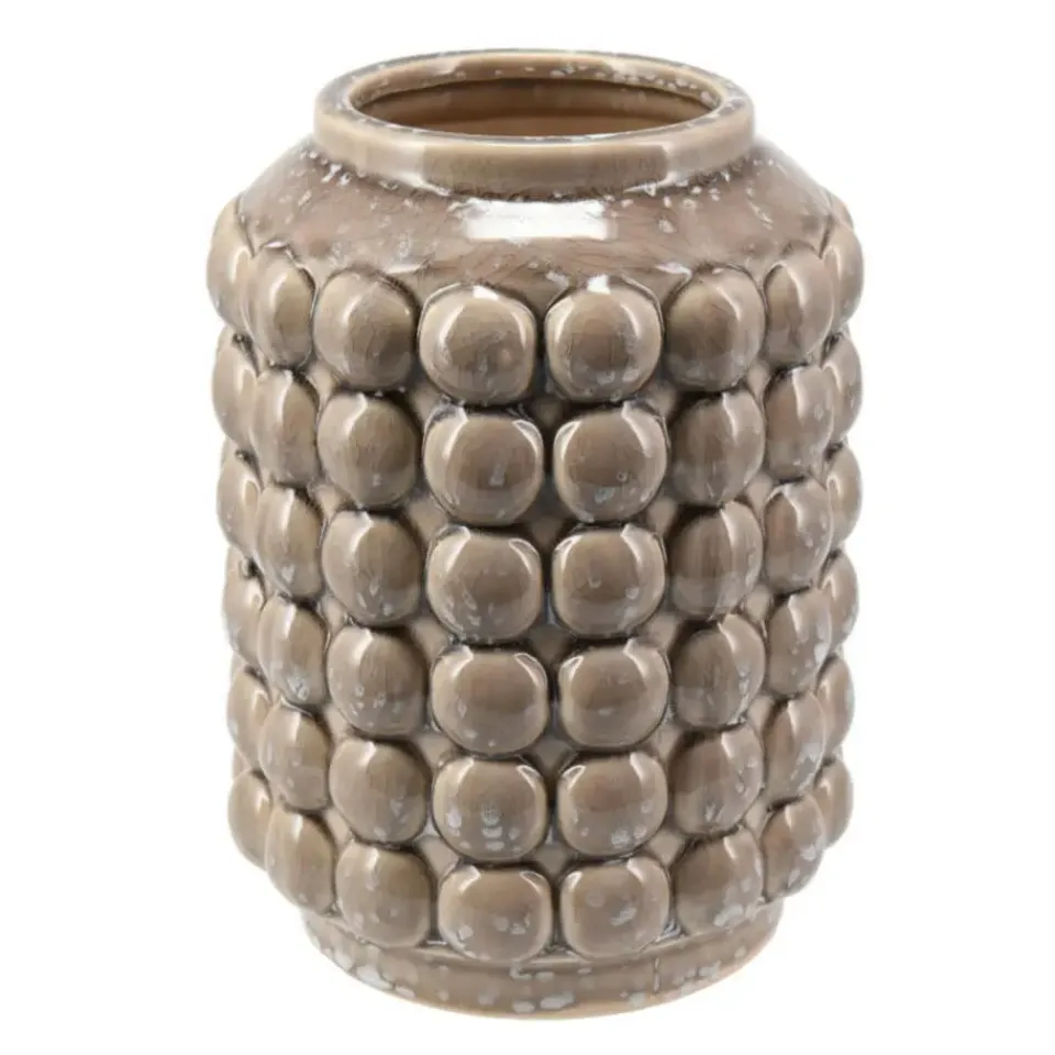 Bloemenvaas Bubbels gemaakt van glanzend keramiek in de kleur beige, met brede opening aan de bovenzijde en decoratieve moderne relief bubbels aan de buitenzijde. Stijlvolle vaas voor binnen in huis. Formaat: D15 x H20 cm. Deze mooie boeket en bloemen vaas is te gebruiken voor allerlei soorten boeketten en/of decoratie stelen en takken. De vaas is handgemaakt en heeft daardoor een mooi elegant eigen karakter. Merk: Home & Styling. Inhoud: 3 liter.