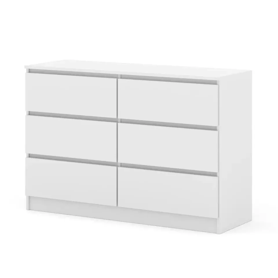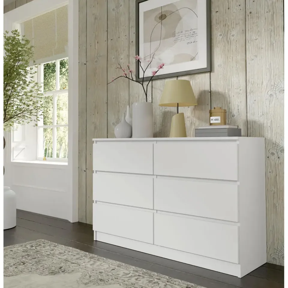 De stevige constructie en ruime laden zorgen voor dagelijks comfort en orde. De dressoir is vervaardigd uit duurzame, 16 mm dikke gelamineerde plaat, terwijl de strakke, greeploze fronten de moderne uitstraling versterken en gebruiksgemak bieden.