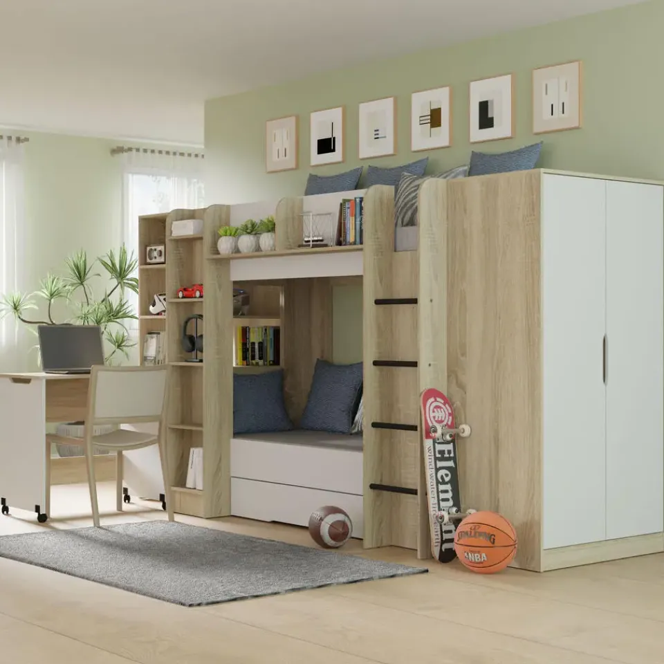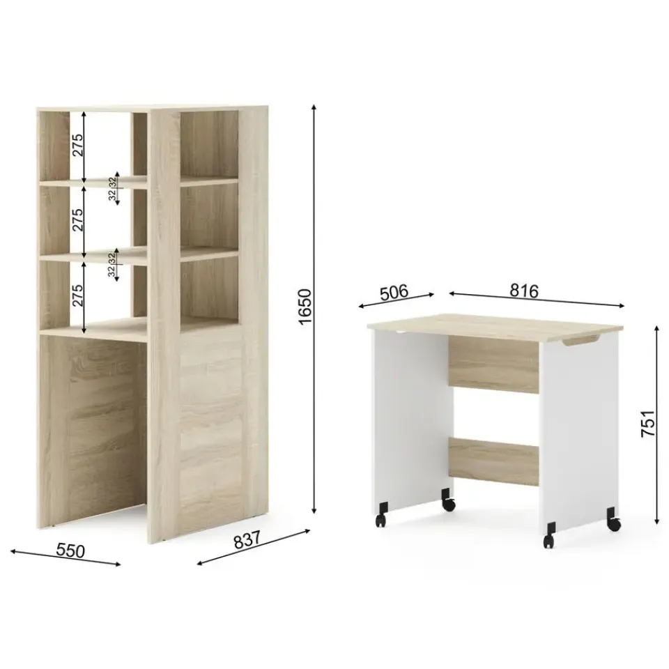 Dankzij de soepel lopende wielen schuift het bureau in een oogwenk uit, waardoor een volwaardige, ergonomische werk- of studieplek ontstaat. Wanneer de taak is voltooid, schuift het discreet onder het rek, waardoor het kantoor verandert in een nette ontspanningsruimte. Zeg vaarwel tegen rommel! Het rek biedt een reeks open planken van verschillende afmetingen. U kunt er boeken, decoraties, ordners of multimedia-apparatuur op tentoonstellen. Deze open constructie vergemakkelijkt niet alleen de toegang, maar vergroot ook de ruimte optisch, waardoor deze lichter wordt. Investeer in een meubelstuk dat voor u werkt en uw ruimte transformeert in een functioneel en stijlvol centrum van huiselijke activiteit!