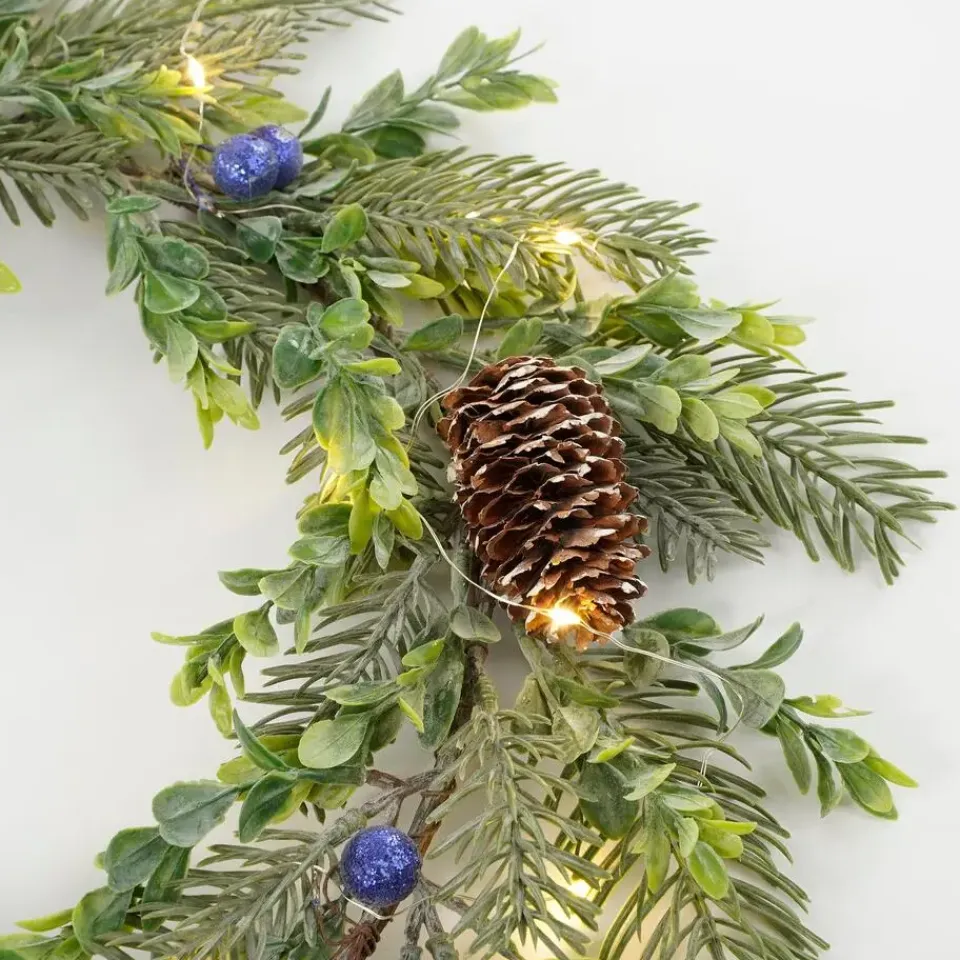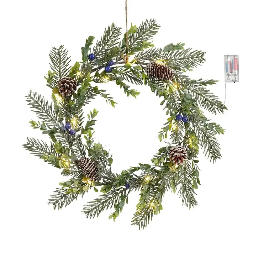 Wil jij tijdens de feestdagen ook genieten van een prachtig versierde kerstkrans? Dan hebben wij dé oplossing voor jou: de kerstkrans van House of Seasons! Deze krans is namelijk al voorzien van mooie, groene dennentakjes, dennenappels en blauwe besjes. In de krans zitten daarnaast 15 energiezuinige LED lampjes verwerkt die een warm wit licht uitstralen. De verlichting werkt op 2 AA batterijen. Ideaal! De krans heeft een diameter van 42 cm en is 7 cm hoog, perfect om op te hangen of te gebruiken als basis voor een kerststukje. Het grote voordeel is ook dat je hem elk jaar weer opnieuw kunt gebruiken! Ook leuk om te combineren met meerdere kerstdecoratie artikelen uit de collectie van House of Seasons om een stijlvolle kerstsfeer in huis te creëren.