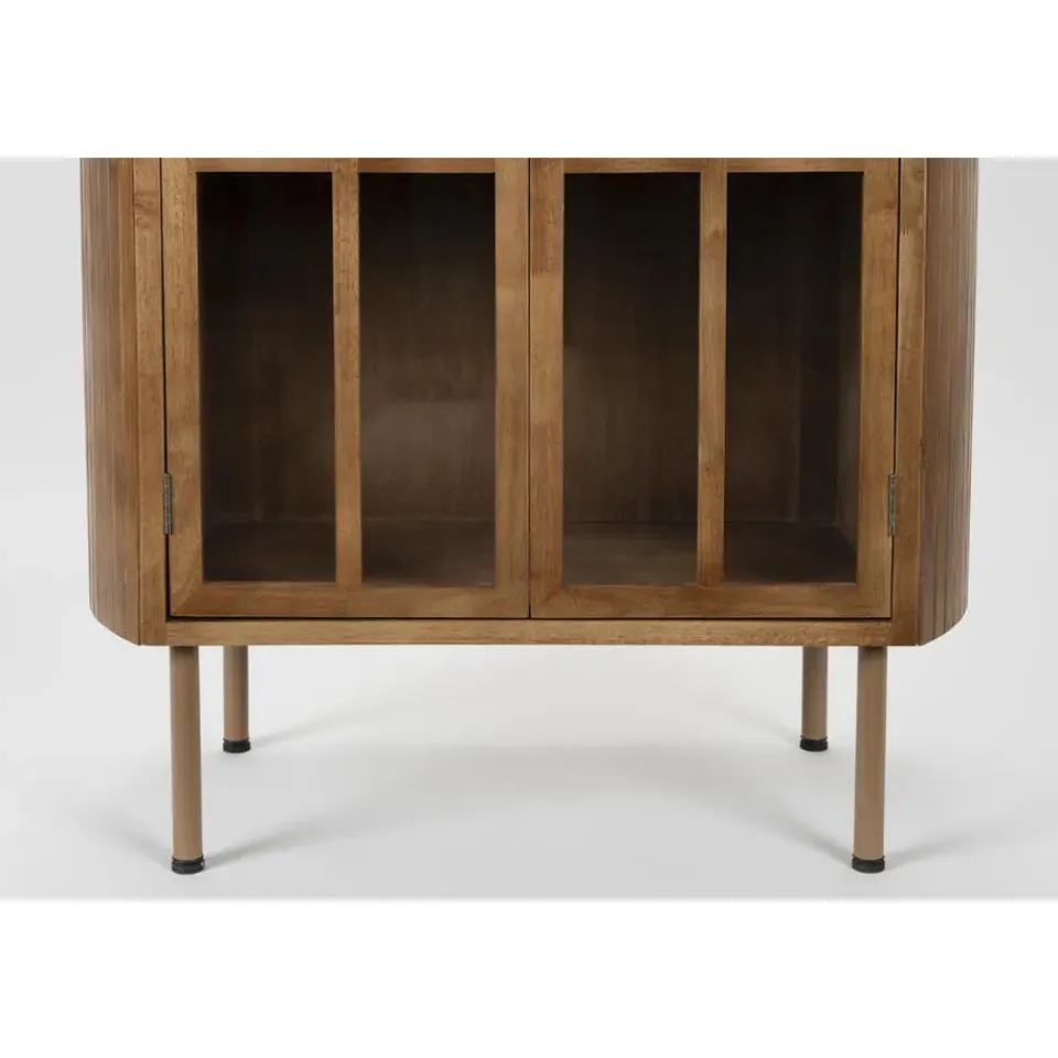 Ontdek de Yaz serie: stijlvolle dressoirs in twee hoogtes. Deze bruine rubberhouten kasten met elegante latjes en glazen deurtjes zijn perfect voor elke interieurstijl.