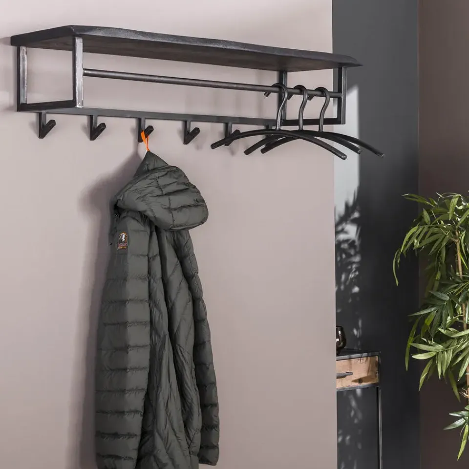 Deze kapstok ‘Yucon’is voorzien van een hoedenplank gemaakt van massief acacia hout. Zorgvuldig geselecteerd hout, voorzien van een fijne nerf en diverse noesten, die op ambachtelijke wijze wordt verwerkt met een zwarte finish. Dit zorgt voor een natuurlijke én unieke look aan de wand. Aan de hoedenplank is een geschuurde metalen roede bevestigd en zijn er 6 haakjes aanwezig. Er kunnen dus zowel jassen aan een haakje als aan een hanger worden opgehangen. De kapstok is voorzien van twee bevestigingsogen aan de achterzijde, zodat de kapstok eenvoudig aan de wand kan worden gemonteerd.