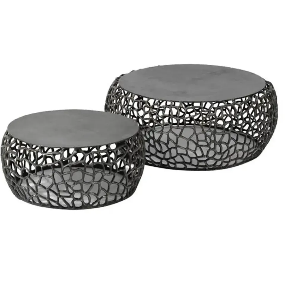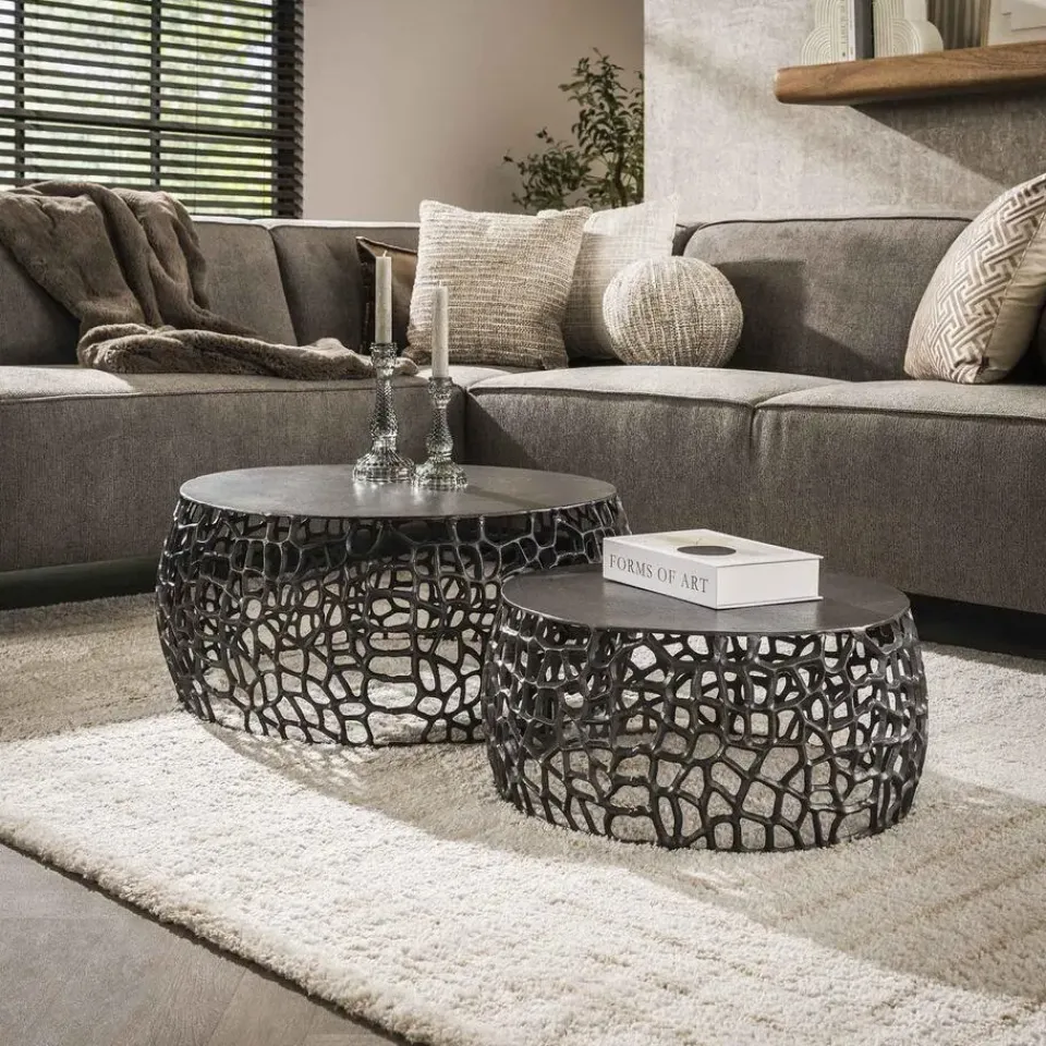 Deze salontafel bestaat uit een set van 2. Beide tafels zijn voorzien van een zandgegoten dun bovenblad van zwart nikkel. Het decoratieve onderstel is uitgevoerd in aluminium en geeft de salontafels een speels uiterlijk. Afmetingen L: 55 cm, B: 55 cm, H: 25 cm / L: 75 cm, B: 75 cm, H: 30 cm.