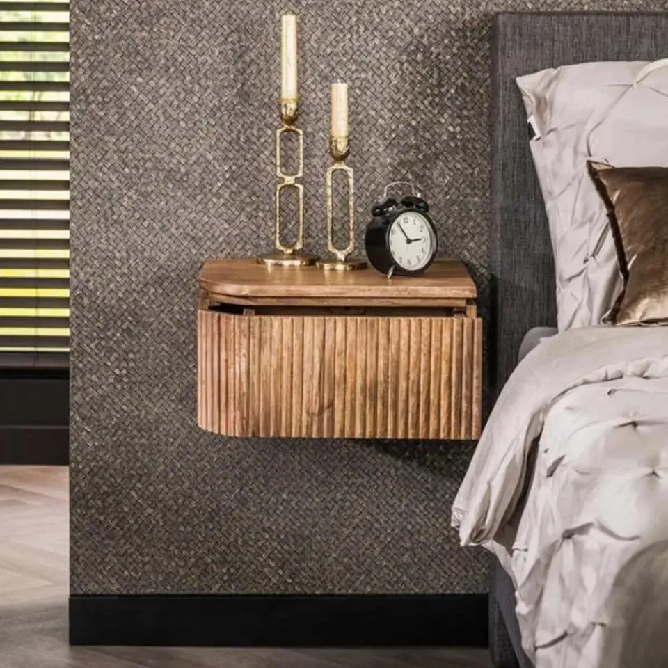 Dit hangende nachtkastje ‘wave’ bestaande uit een set van 2 is gemaakt van duurzaam mango hout en heeft een eigentijds design met een golfontwerp. De set bestaat uit een linker en een rechter kant. Het wordt bevestigd aan de muur met een strip met drie schroefgaten, waardoor het zweeft en ruimte bespaart. Zie hiervoor de foto. Deze set maakt onderdeel uit van de ‘wave’ serie.
