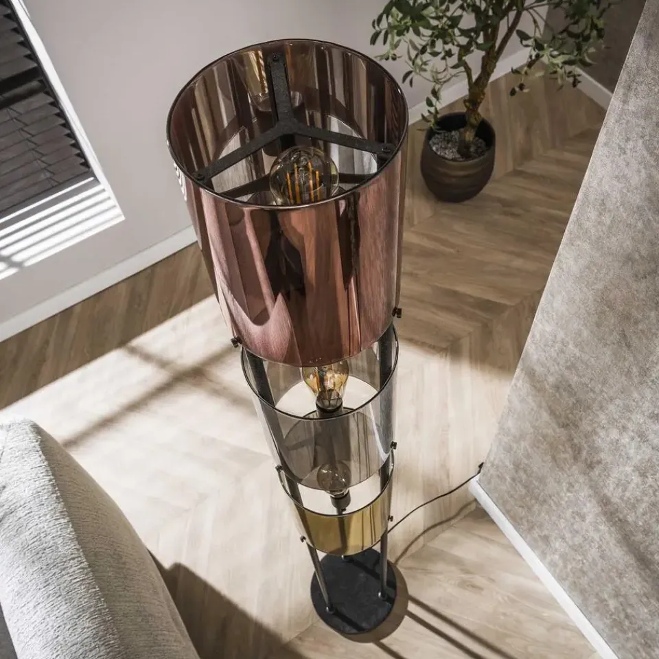 De vloerlamp Lucente is voorzien van drie glazen kappen in koper-, zilver- en goudkleurig. Het armatuur is afgewerkt in een artic black finish. Voor een optimaal resultaat wordt lichtbron artikel 8450 geadviseerd.