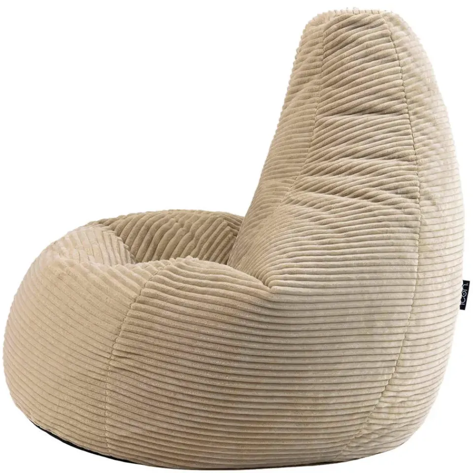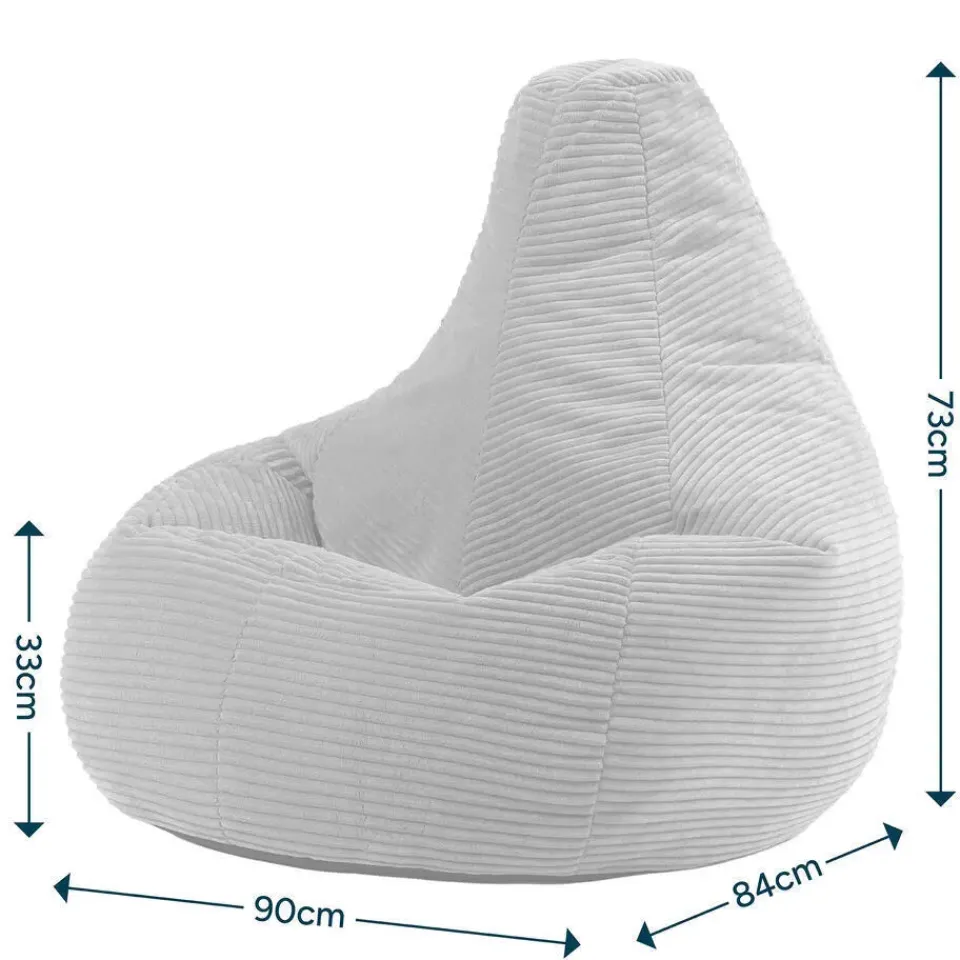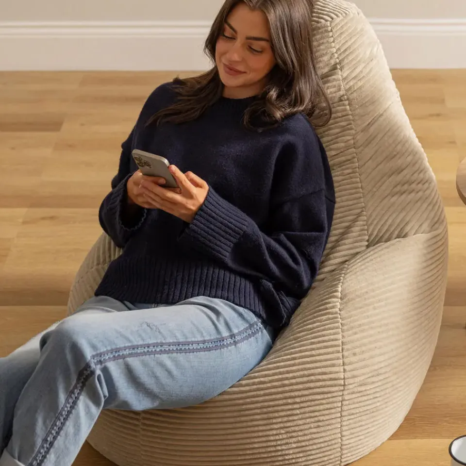 RELAX EN LEUN ACHTEROVER; Deze zitzakzetel is gemaakt om lang in te zitten, vervaardigd in super zacht corduroy en gevuld met precies de juiste hoeveelheid kralen voor een perfect ondersteunend inzakeffect.