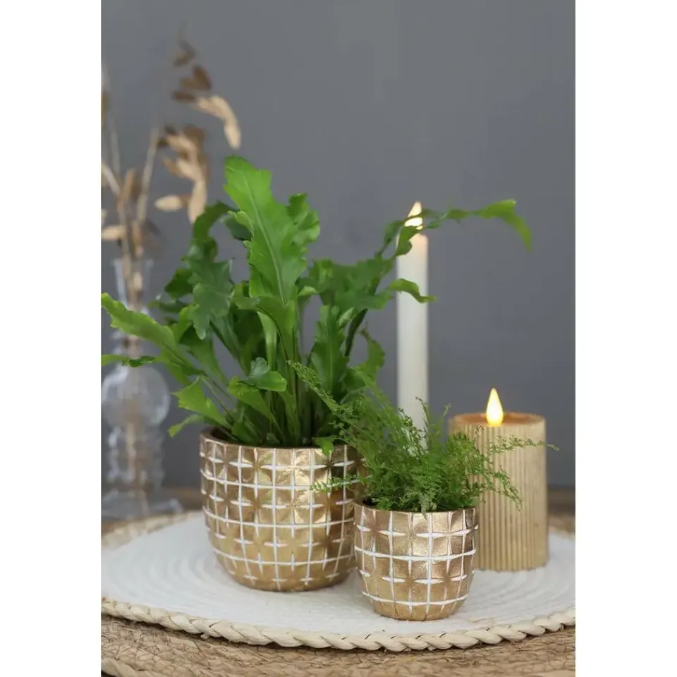 Bloempot/plantenpot Hanoi ruit motief in goud. Bloempot met een luxe uitstraling waarin planten en bloemen volledig tot hun recht komen. Te gebruiken voor allerlei soorten (kunst) kamerplanten, maar ook leuk om bijvoorbeeld een paar takken of droogbloemen in te zetten. Deze eyecatcher voor in huis past in ieder interieur. Afmetingen: D14 x H12 cm. Materiaal: Aardewerk. Geschikt voor binnenshuis.