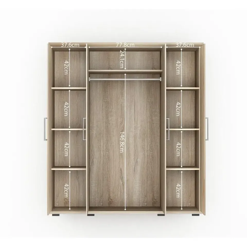 De Interiax Kledingkast ‘Mila’ in Sonoma Eik biedt een ruime en stijlvolle oplossing voor al je opbergbehoeften. Met afmetingen van 183x160x52 cm is deze kast ideaal voor het opbergen van kleding, beddengoed en accessoires, zonder aan stijl in te boeten. De kast beschikt over 4 deuren, een ruime hanger voor het ophangen van kleding, en 6 legplanken die voldoende ruimte bieden voor gevouwen kleding en andere items. Het warme Sonoma Eik design zorgt voor een natuurlijke uitstraling die naadloos in verschillende interieurstijlen past.