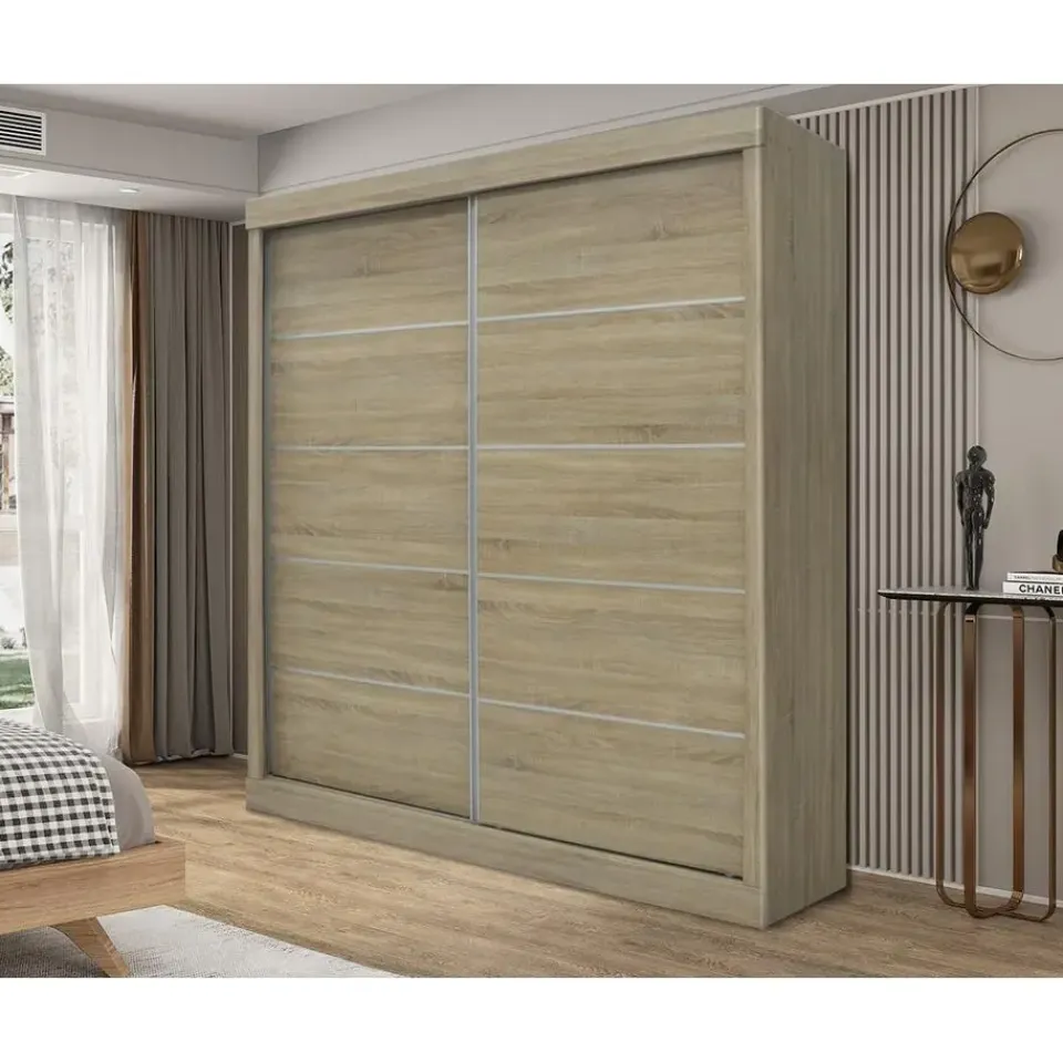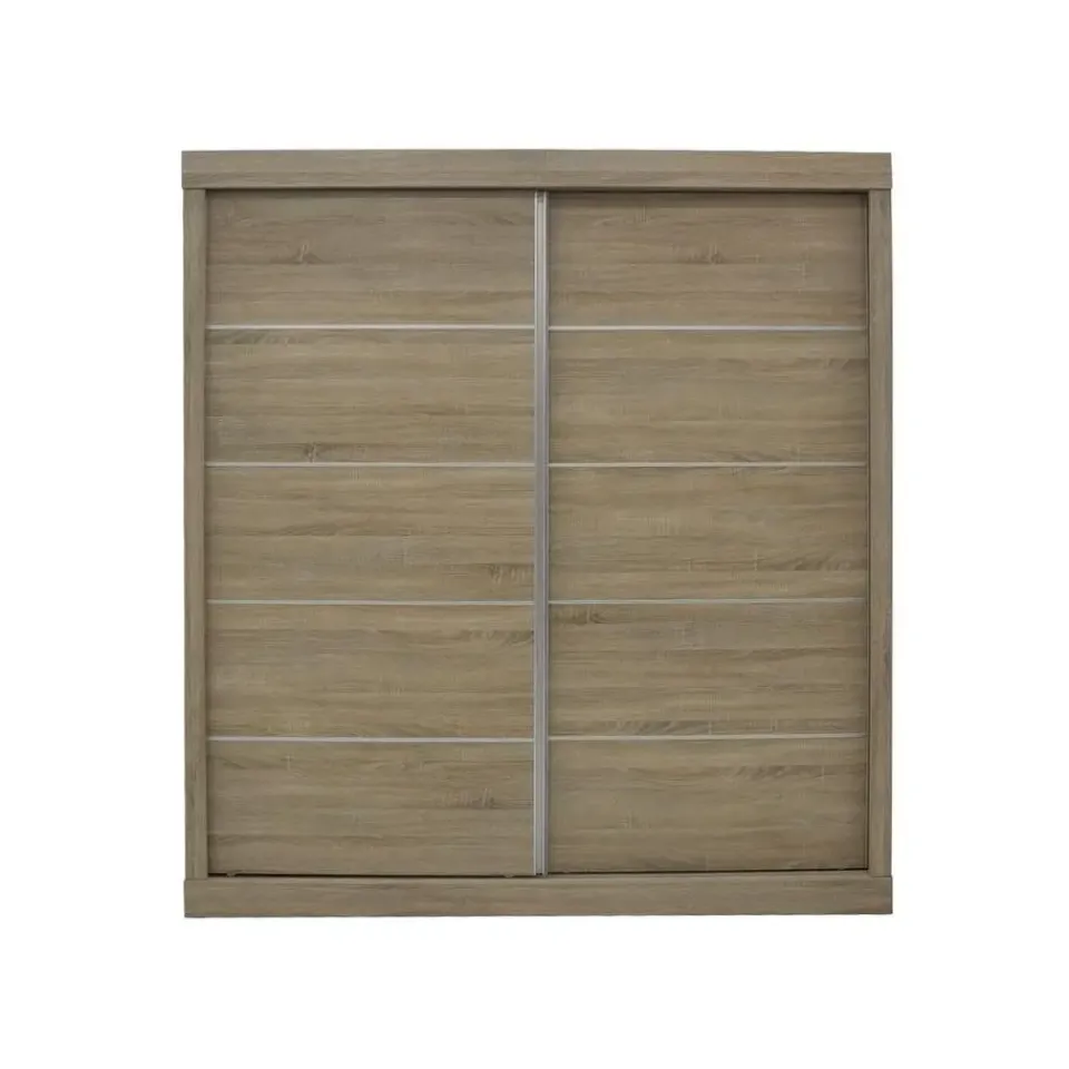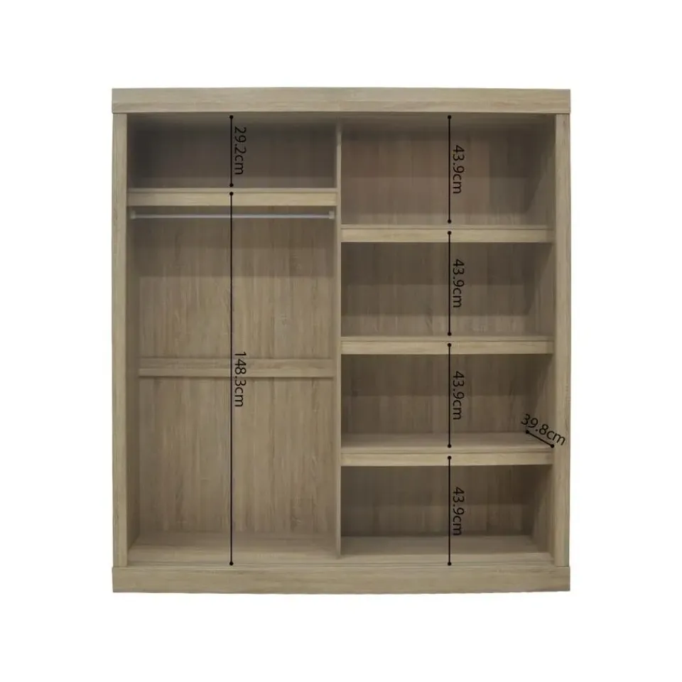 De Interiax Kledingkast ‘Mila’ in Sonoma Eik is de ideale schuifdeurkast voor wie op zoek is naar stijl en efficiëntie in opbergen. Met royale afmetingen van 197.5×182.5×52.5 cm biedt deze kast veel ruimte zonder extra vloeroppervlak in beslag te nemen. De kast beschikt over een ruime hanger voor het netjes ophangen van kledingstukken zoals jassen, jurken en overhemden, en 4 legplanken om kleding, beddengoed en accessoires overzichtelijk te organiseren. Het schuifdeursysteem zorgt voor een moderne uitstraling en maakt de kast extra geschikt voor kleinere ruimtes.