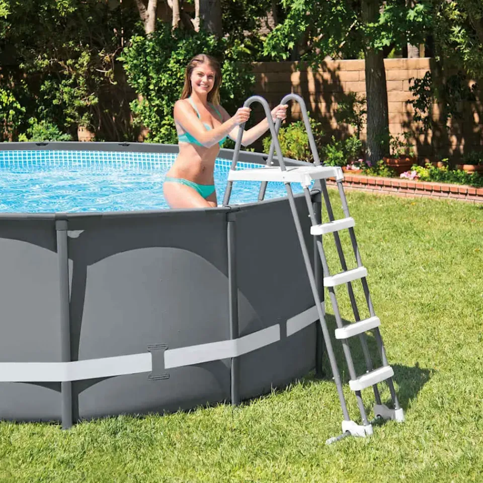 De Intex zwembadladder, ontworpen voor bovengrondse zwembaden, zorgt ervoor dat gebruikers het zwembad makkelijk en veilig kunnen betreden en verlaten.