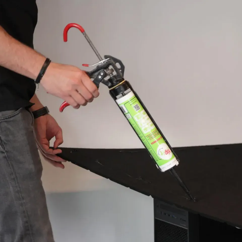 De PET-vilt panelen kunnen met dubbelzijdige tape of met MS-polymeerkit aan de muur bevestigd worden. Dit werkt het beste op gladde, stofvrije oppervlakken. Voor bevestiging aan het plafond adviseren wij het gebruik van kit.