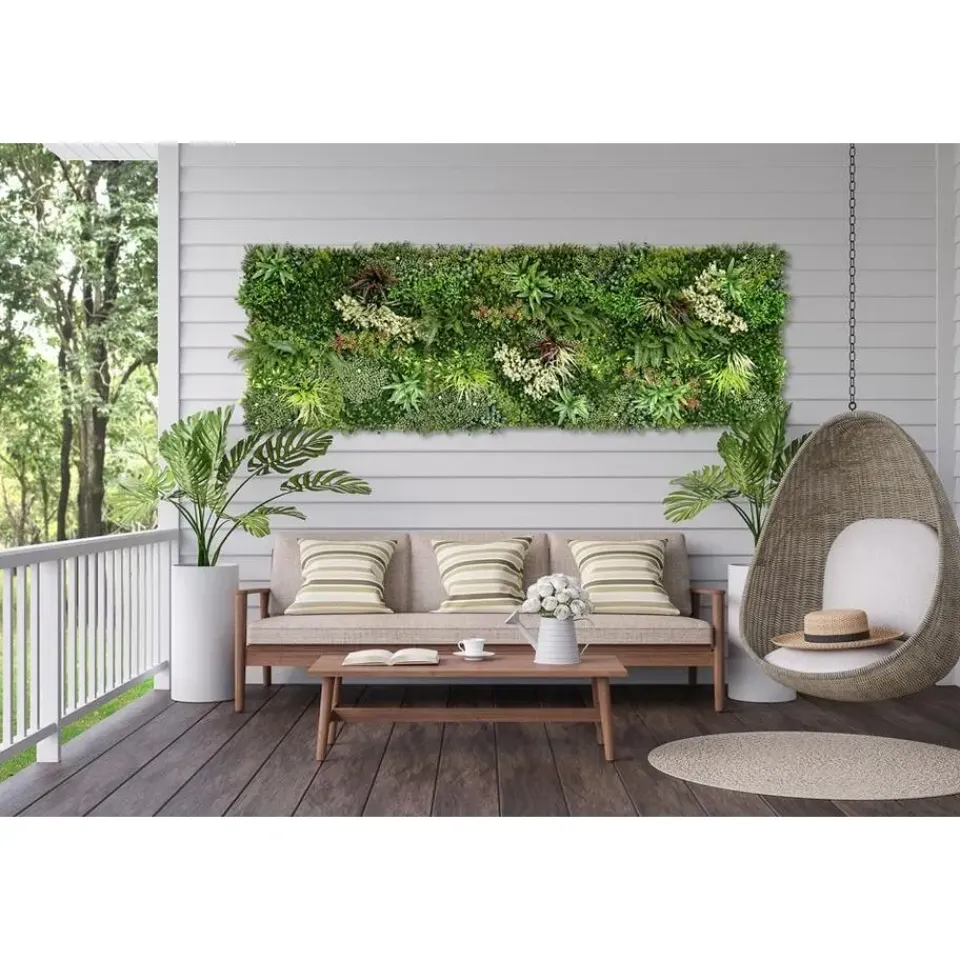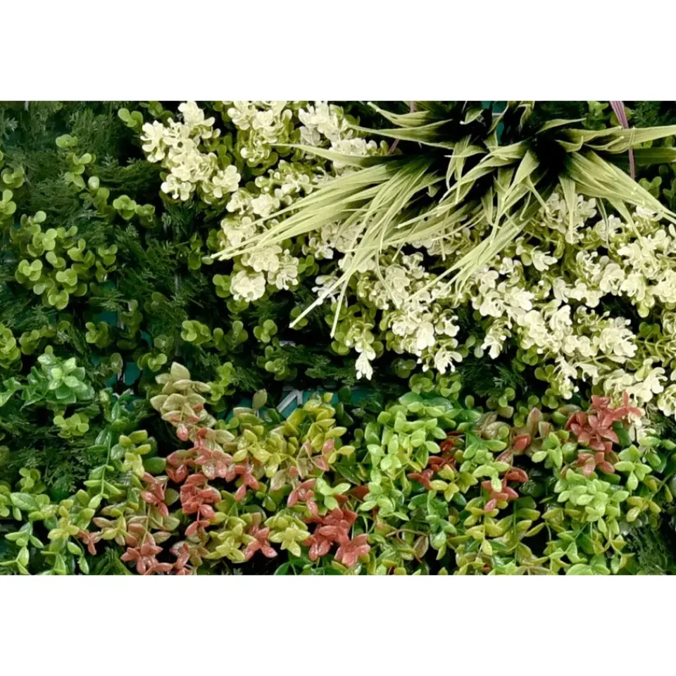 De kunstheg is ontworpen om een natuurlijke sfeer te creëren op iedere gewenste locatie. Deze decoratieve wandpanelen zijn bedekt met een mix van groene planten. De varens en kleine bloemen geven de kunsthaag een levendige en natuurlijke uitstraling. Ze kunnen gebruikt worden voor verschillende ruimtes en gelegenheden, zowel binnen als buiten.