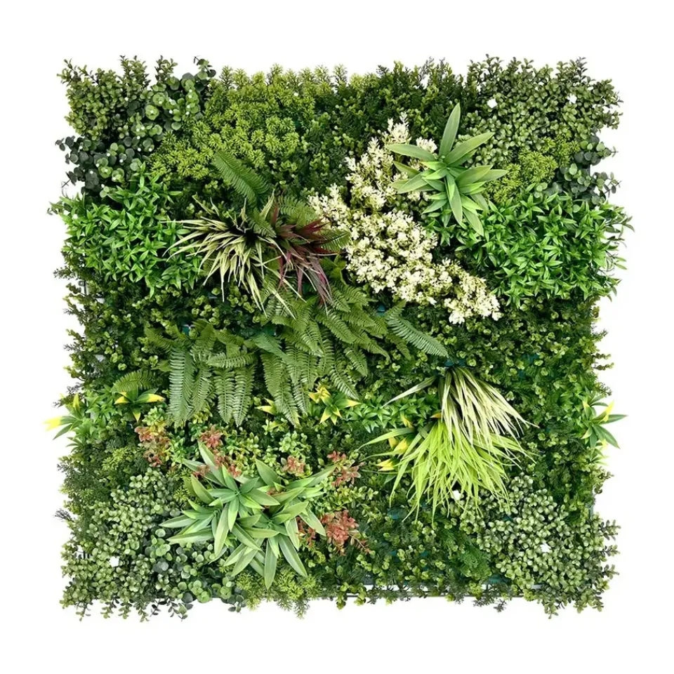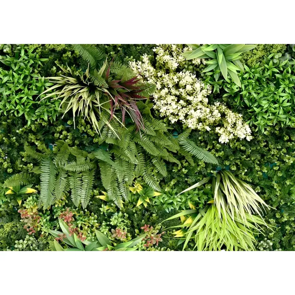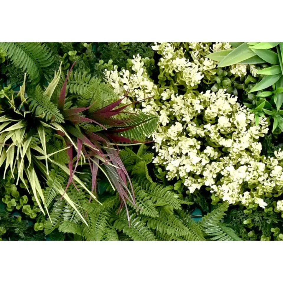 De kunstheg is ontworpen om een natuurlijke sfeer te creëren op iedere gewenste locatie. Deze decoratieve wandpanelen zijn bedekt met een mix van groene planten. De varens en kleine bloemen geven de kunsthaag een levendige en natuurlijke uitstraling. Ze kunnen gebruikt worden voor verschillende ruimtes en gelegenheden, zowel binnen als buiten.