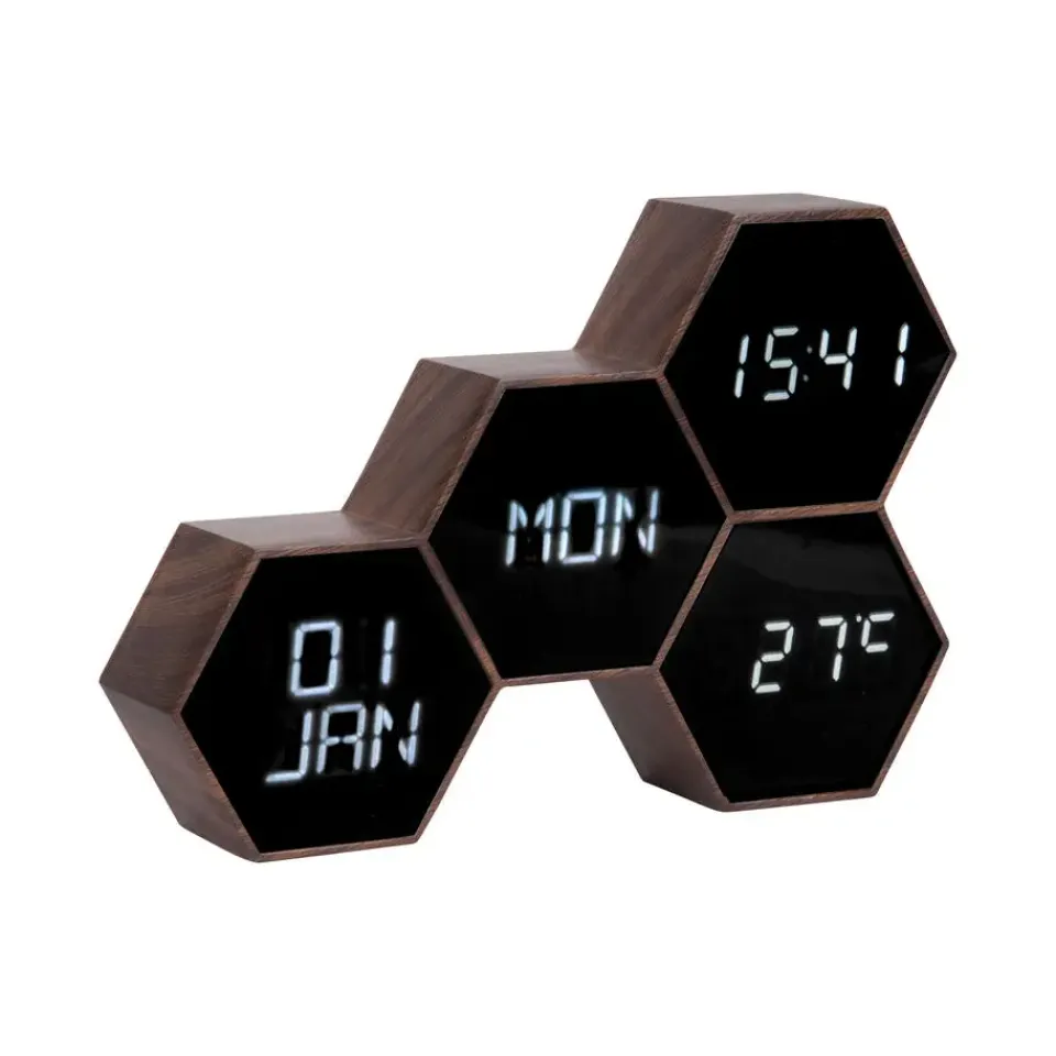 Deze moderne digitale wekker van Karlsson met usb-aansluiting helpt je natuurlijk om op tijd op te staan. Maar zeshoekige design wekker Six in the mix kan meer! Je leest de dag, datum en temperatuur eenvoudig af én hij reageert bij aanraking of geluid. Handig! Dankzij dit goudkleurige pareltje naast je bed stap jij dagelijks met je goede been uit bed. Karlsson klokken en wekkers zijn wereldwijd favoriet. Een kleine greep uit het aanbod: de Karlsson block wekker, Karlsson wekker square, óf een wekker van hout of koper.