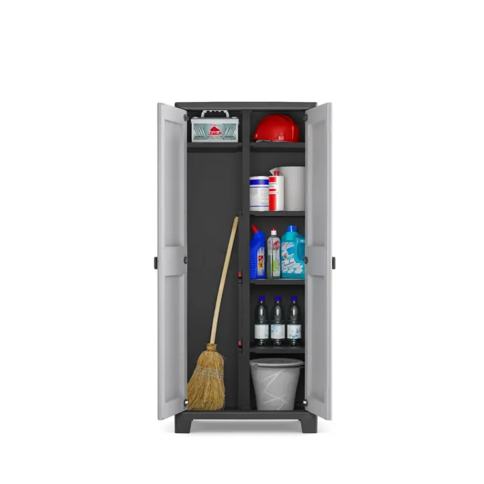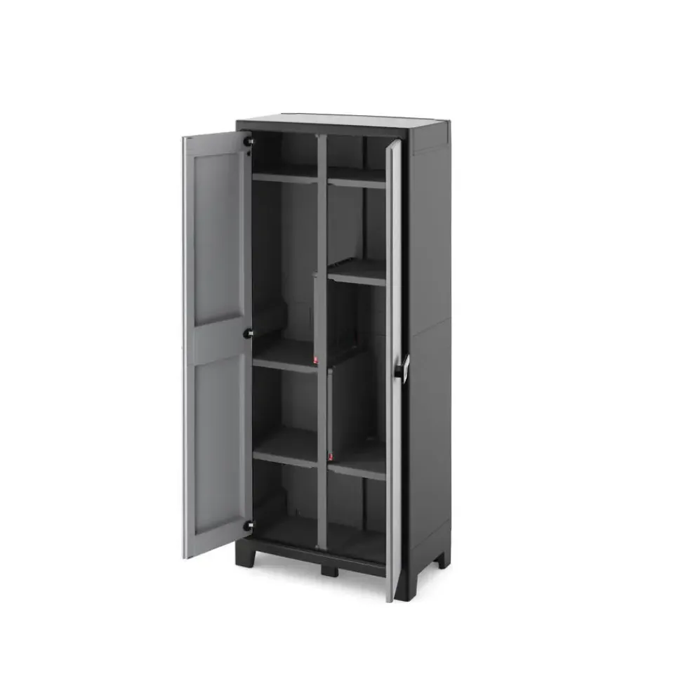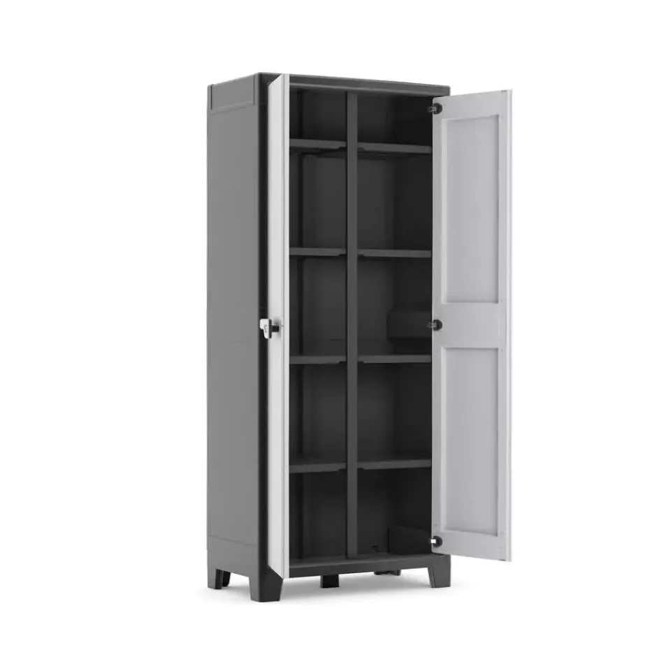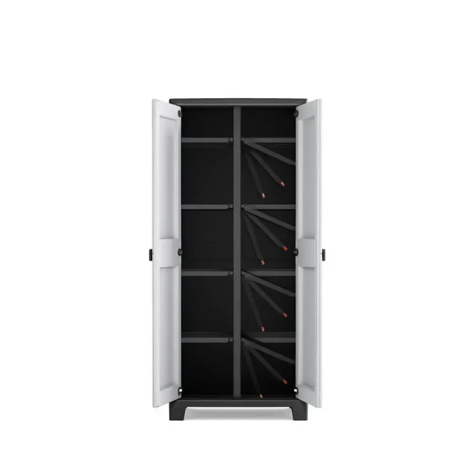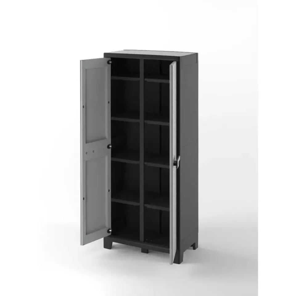 Met metalen scharnieren, afsluitbare deuren (slot niet inbegrepen) en verstevigde bodems is dit een perfecte stellingkast en balkonkast. De achterkant van de tuinkast is gemaakt van polypropyleen platen. Het grote voordeel ten opzichte van een kartonnen achterkant is dat een achterkant van polypropyleen geen water absorbeert.