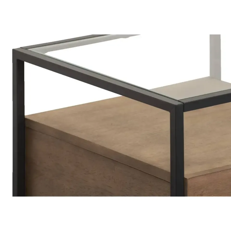 Bijzettafel Michel heeft een afmeting van 43x43x45 cm en is uitermate goed te combineren met andere producten uit dezelfde serie. Door de stalen poten en houten tafelblad met notenpatroon heeft deze bijzettafel een stoere industriële look. Op de glazen plaat kun je gemakkelijk jouw favoriete decoratie wegzetten en de lade biedt voldoende opbergruimte.