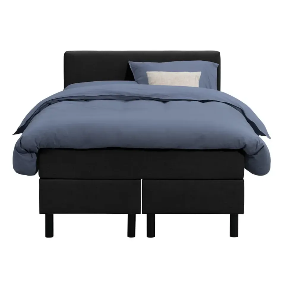 Boxspring Varberg met hoofdbord is een complete boxcombinatie en wordt geleverd inclusief pocketvering matras en een comfortschuim topmatras. Deze combinatie zorgt voor een optimale ondersteuning en een heerlijk ligcomfort. Dankzij de zwarte kleur past deze boxspring perfect in een moderne slaapkamer en creëert het een stijlvolle uitstraling.