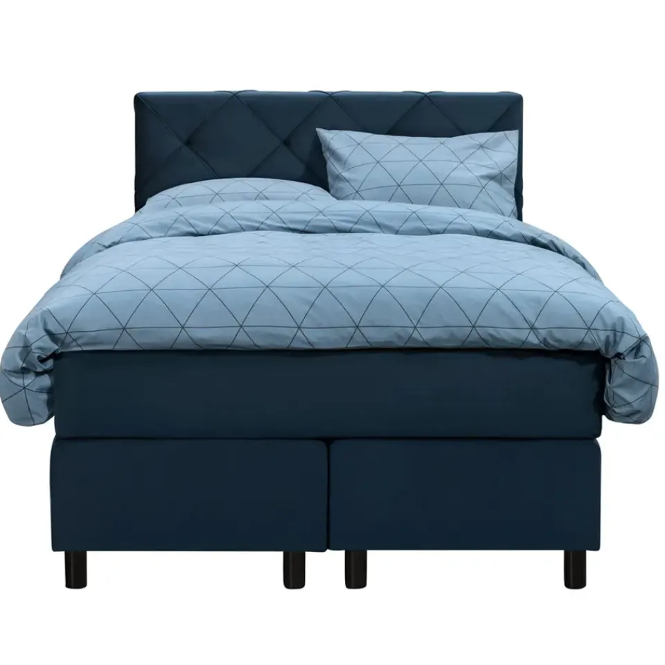 Boxspring Liv is een boxspring met een afmeting van 120×200 cm. Deze prachtige boxspring is bekleed met een velvet blauwe stof en heeft een romantische uitstraling met een geruit hoofdbord. De Liv geruit is uitgerust met een pocketveringmatras en daarnaast ook nog een koudschuim topdekmatras voor extra comfort. Het pocketveringmatras is omkeerbaar, bestaande uit zowel een medium- als een stevige kant. Hierdoor kun je zelf kiezen wat voor jou het meest comfortabel ligt.