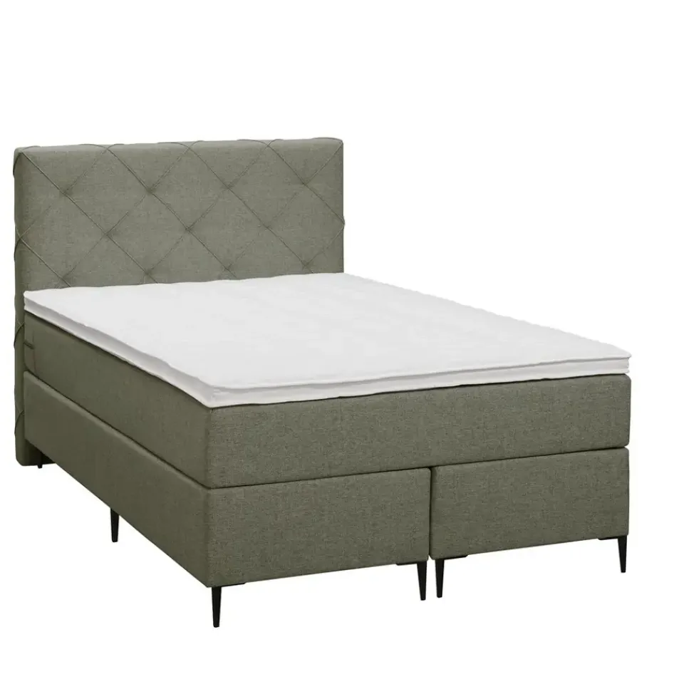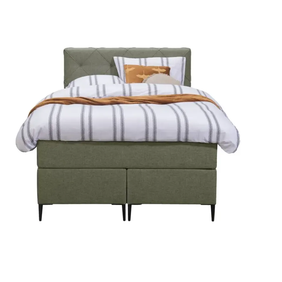 Boxspring Liv is een boxspring met een afmeting van 120×200 cm. Deze prachtige boxspring is bekleed met een fijn geweven groene stof en heeft een romantische uitstraling met een geruit hoofdbord. De Liv geruit is uitgerust met een pocketveringmatras en daarnaast ook nog een koudschuim topdekmatras voor extra comfort. Het pocketveringmatras is omkeerbaar, bestaande uit zowel een medium- als een stevige kant. Hierdoor kun je zelf kiezen wat voor jou het meest comfortabel ligt.