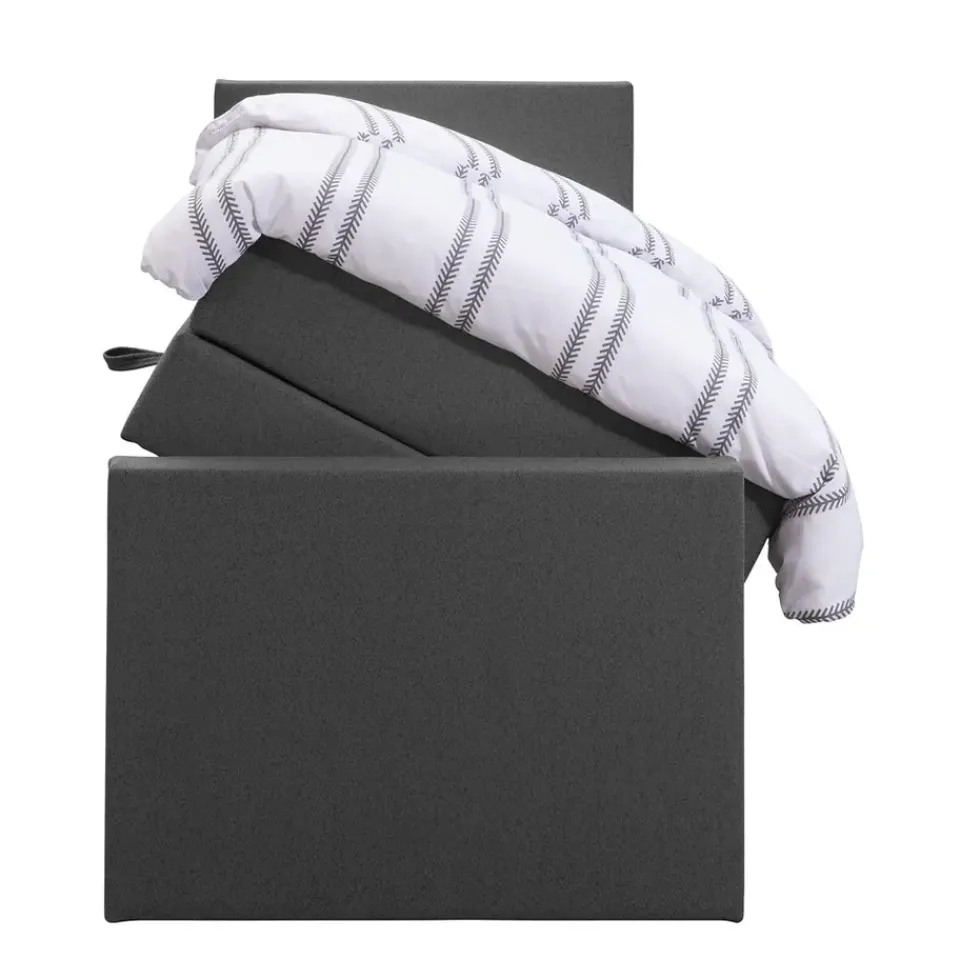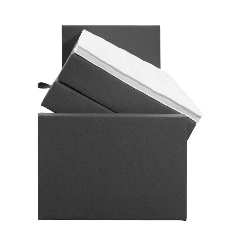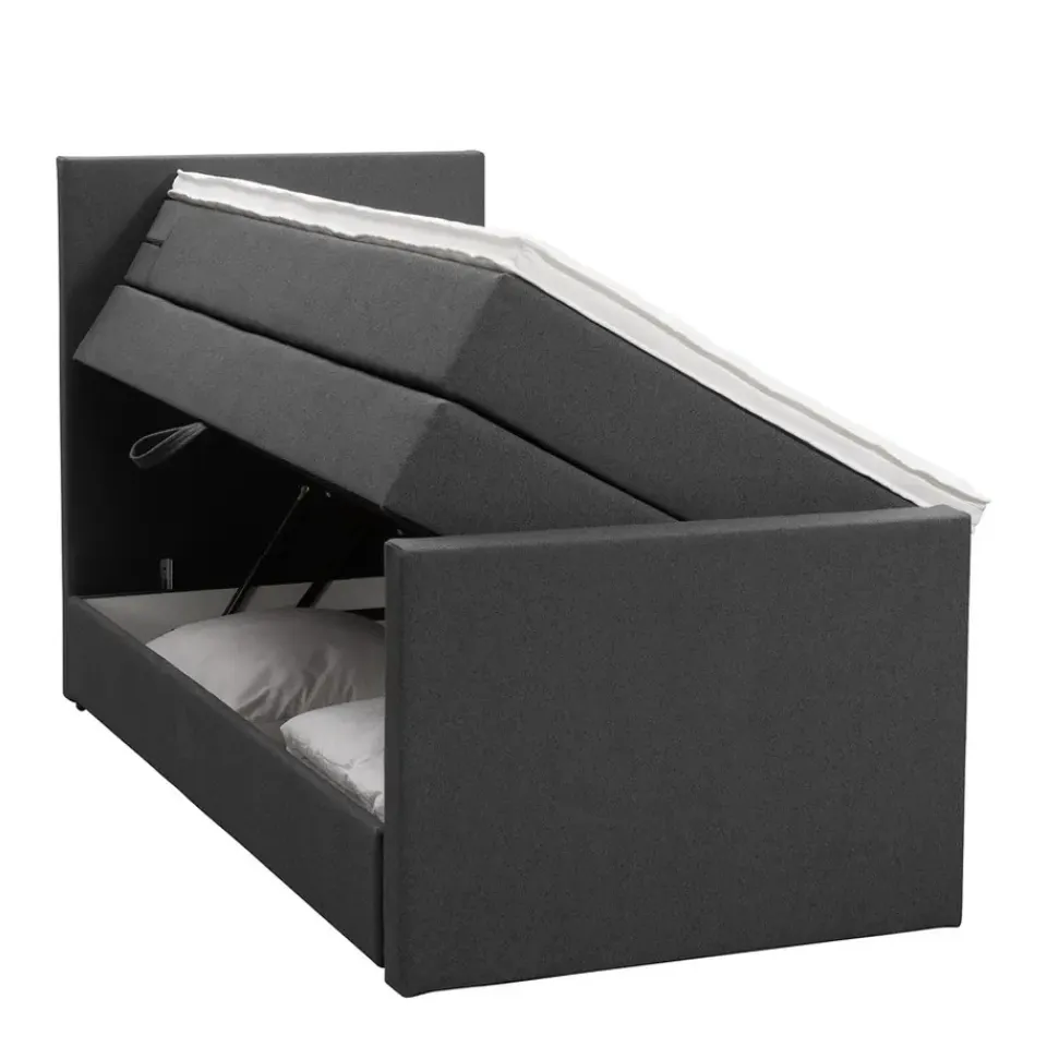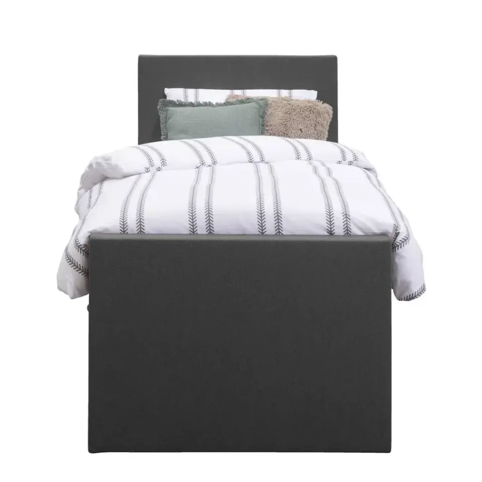 Boxspring met opbergruimte Liv is een boxspring met een afmeting van 90×200 cm. Deze prachtige boxspring is bekleed met een grof geweven antraciete stof en heeft een strakke uitstraling met een egaal hoofd- en voetbord. De Liv egaal is uitgerust met een pocketveringmatras en daarnaast ook nog een koudschuim topdekmatras voor extra comfort. Het pocketveringmatras is omkeerbaar, bestaande uit zowel een medium- als een stevige kant. Hierdoor kun je zelf kiezen wat voor jou het meest comfortabel ligt.